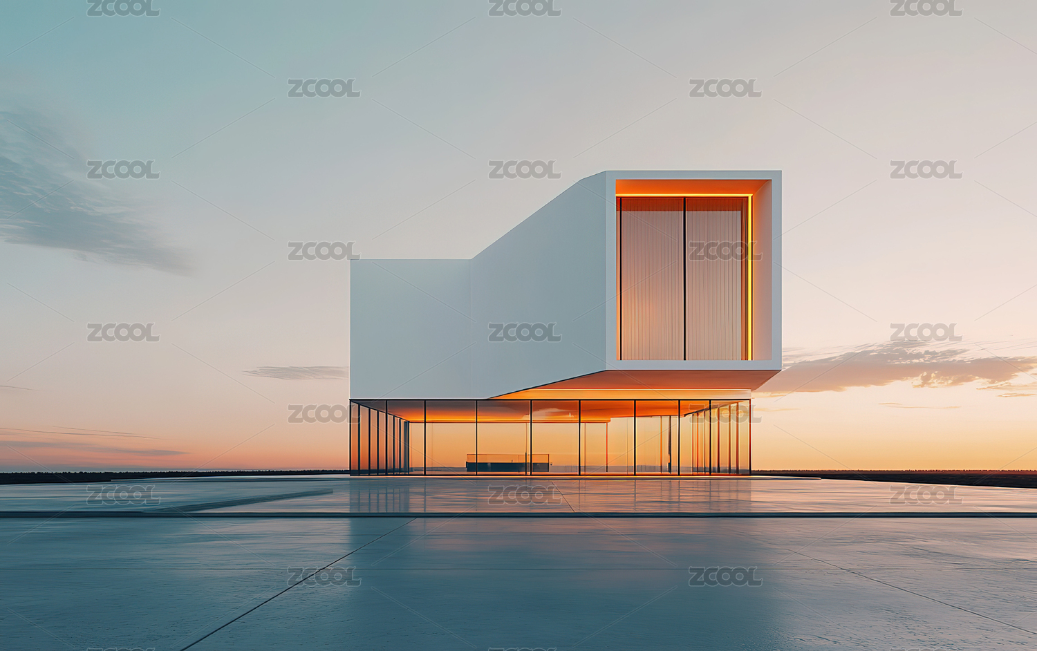 白色极简现代建筑展厅外立面和门前的空地