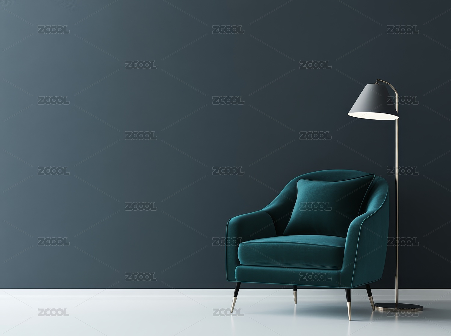 深蓝墙面旁的墨绿扶手椅与落地灯