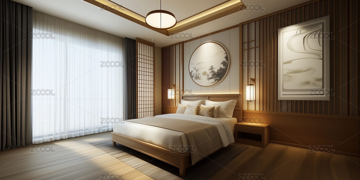 禅意,木制,现代卧室,双人床,被褥,木质床头柜,台灯,白色储物架子,玻璃门,浅色地板