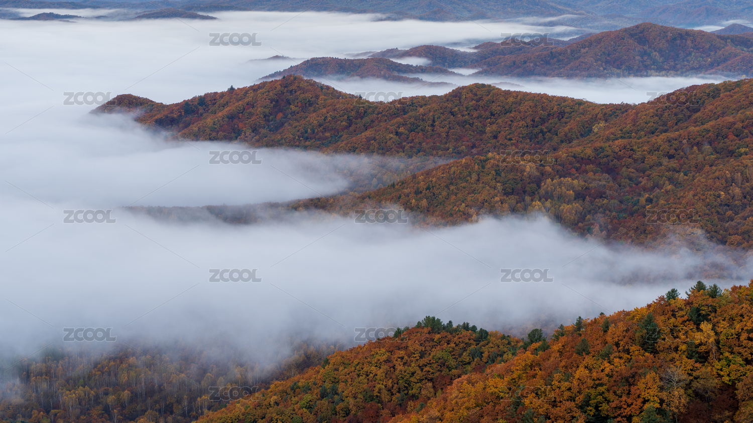 建始高岩子林场秋冬季清晨云雾缭绕五彩斑斓
