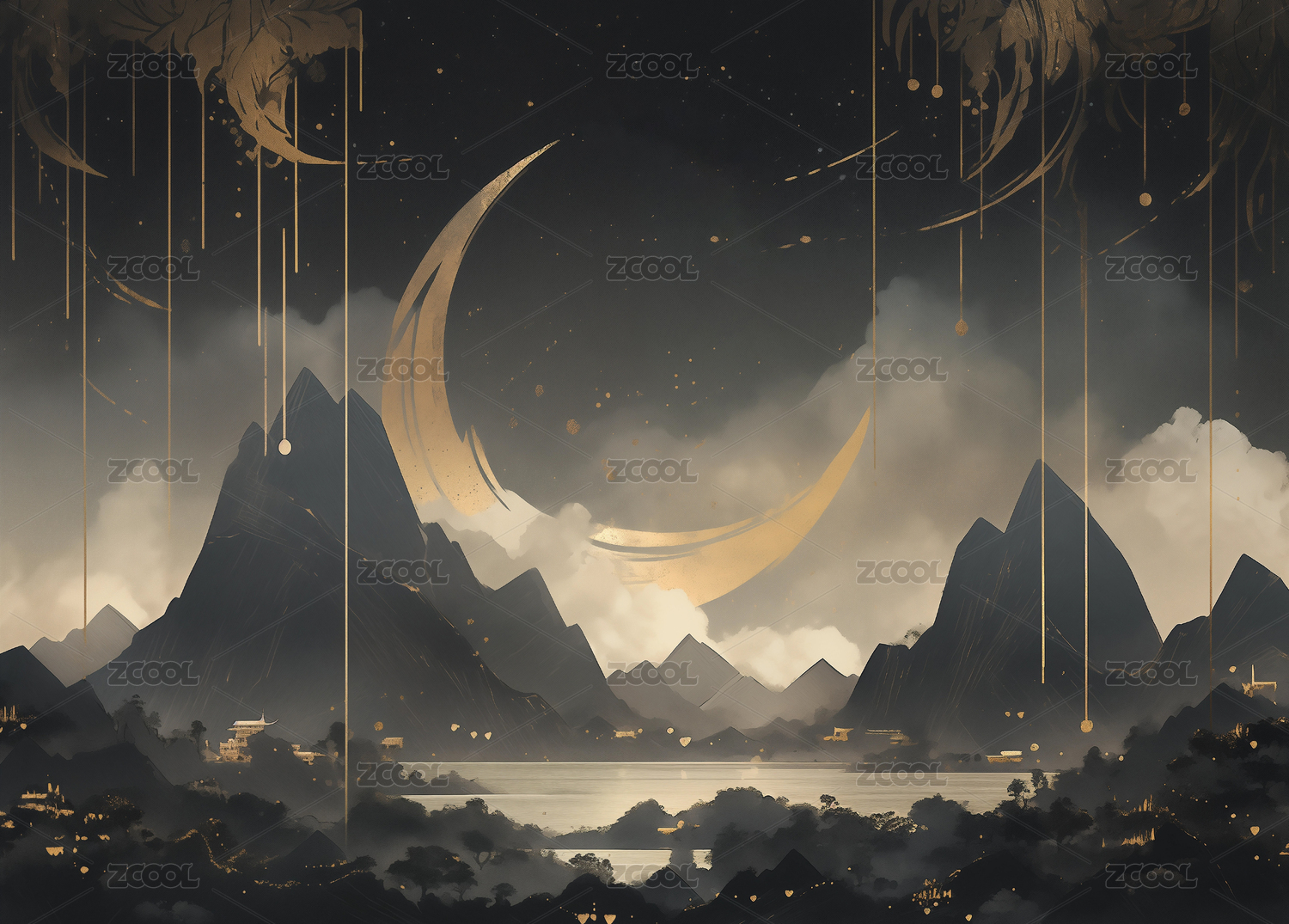 国风月亮下的建筑