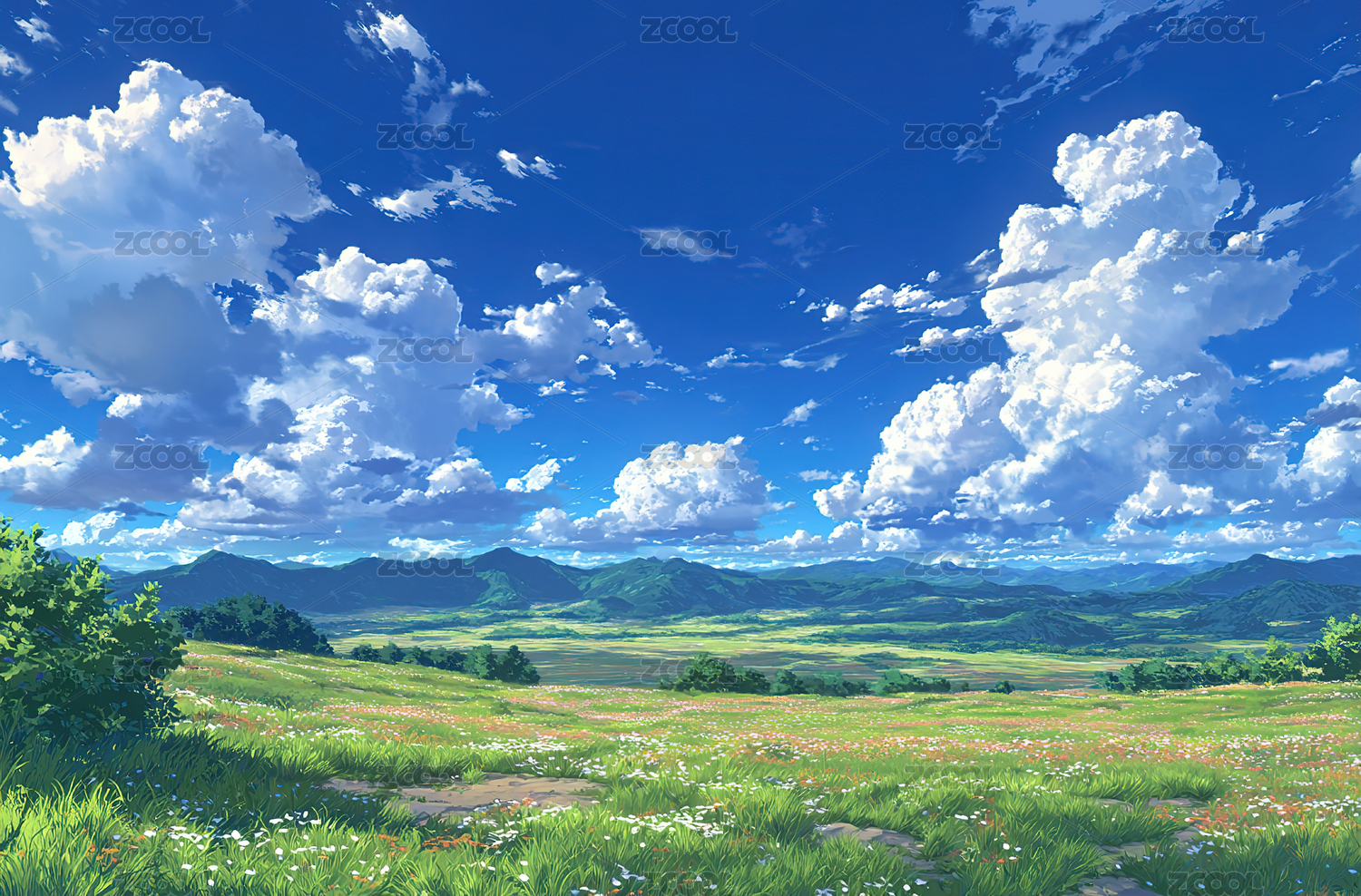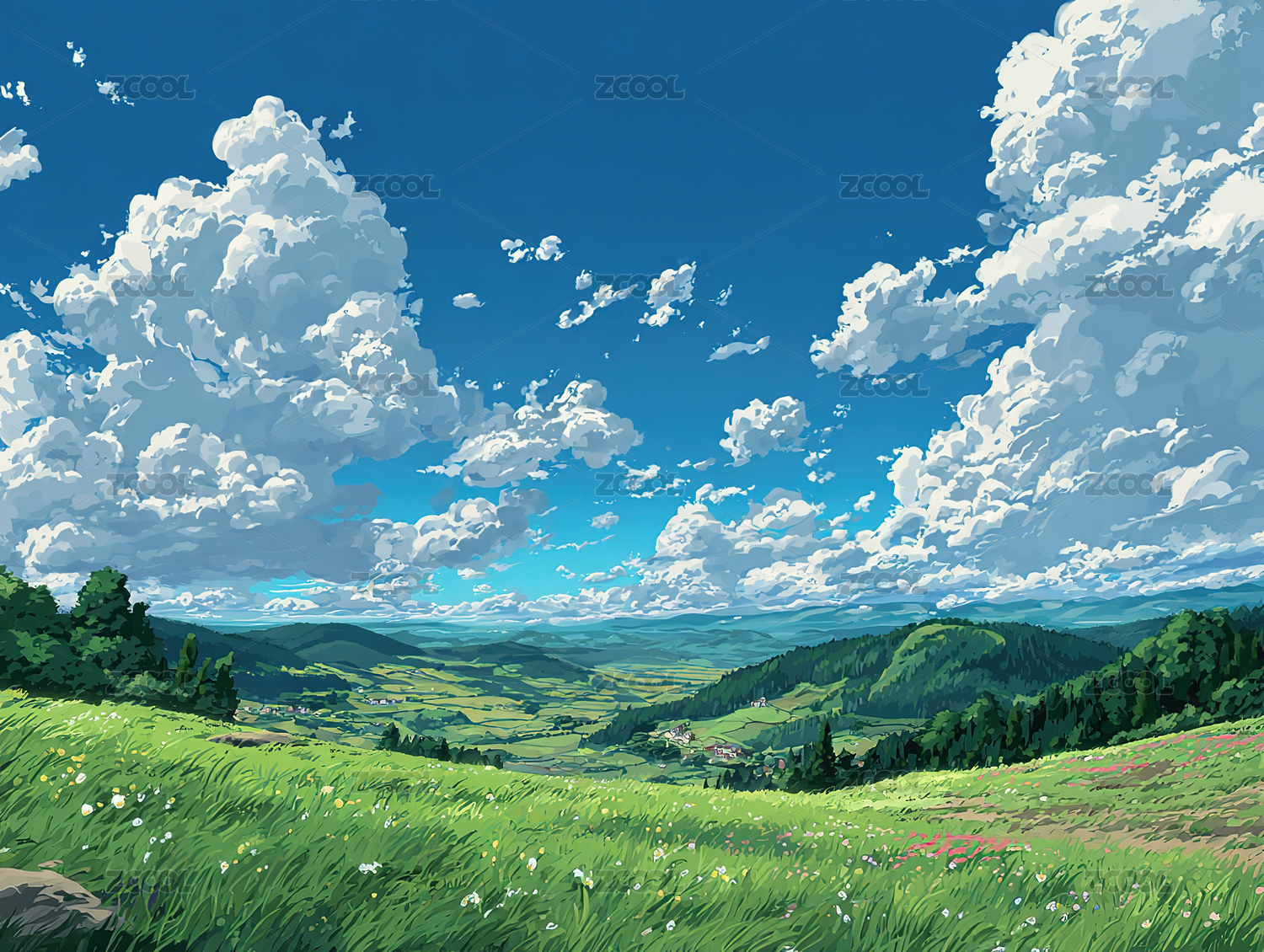 蓝天白云草地绿色鲜花大树插画风景壁纸