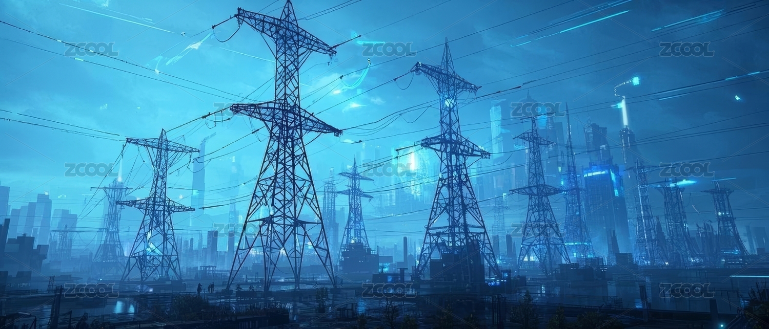 架空输电线路铁塔输送绿色清洁能源科技插画