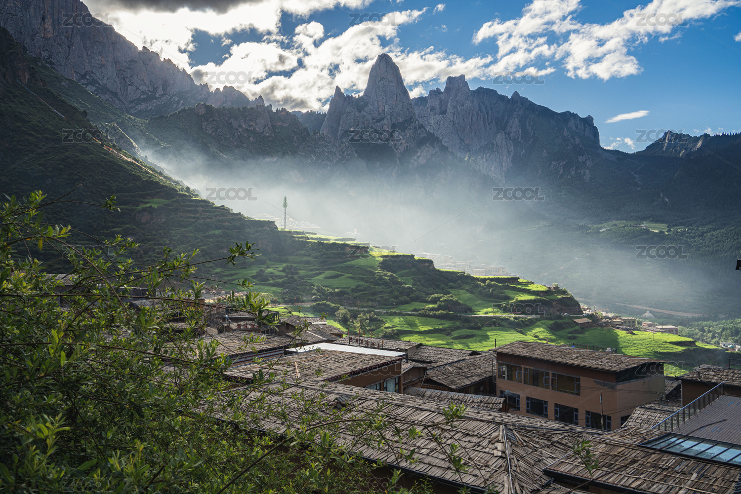 中国甘肃省甘南州迭部县扎尕那的清晨的桑烟