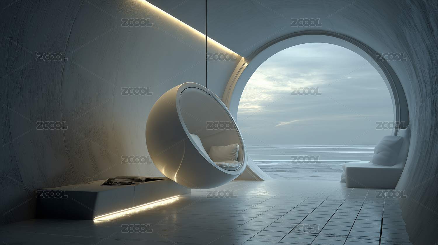白色极简室内空间与海洋背景