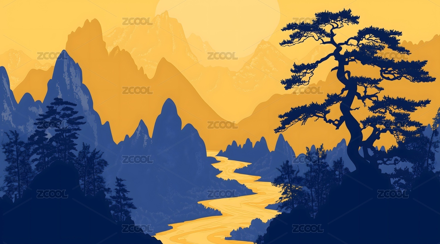 武夷山 溪流峡谷水墨山水风景矢量剪影