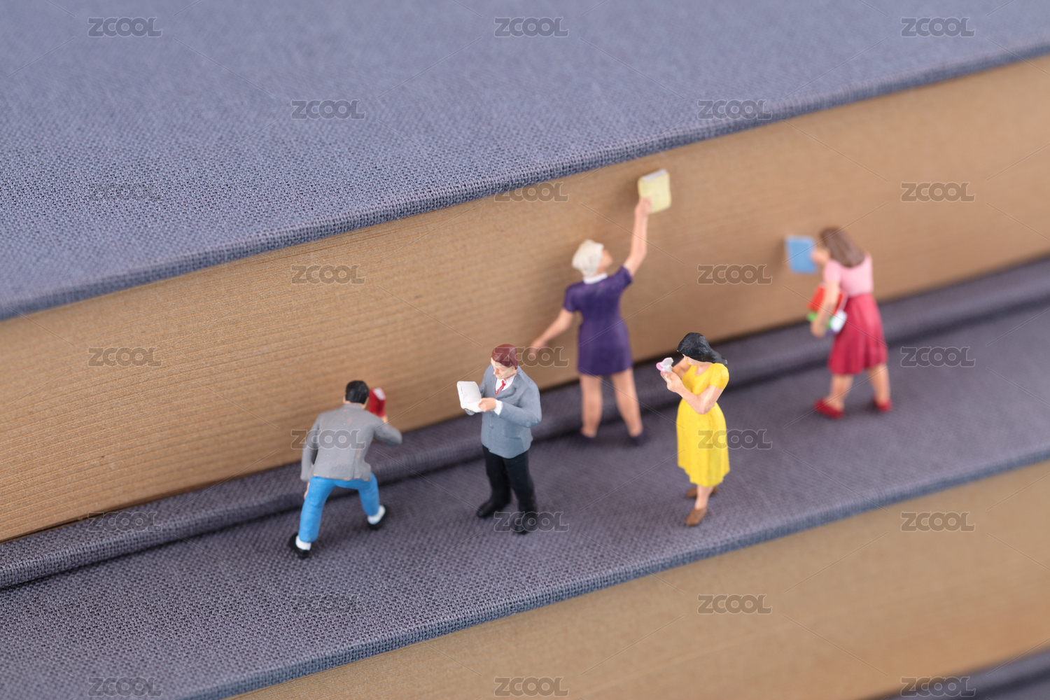 厚厚的一摞书和看书的微缩人偶模型
