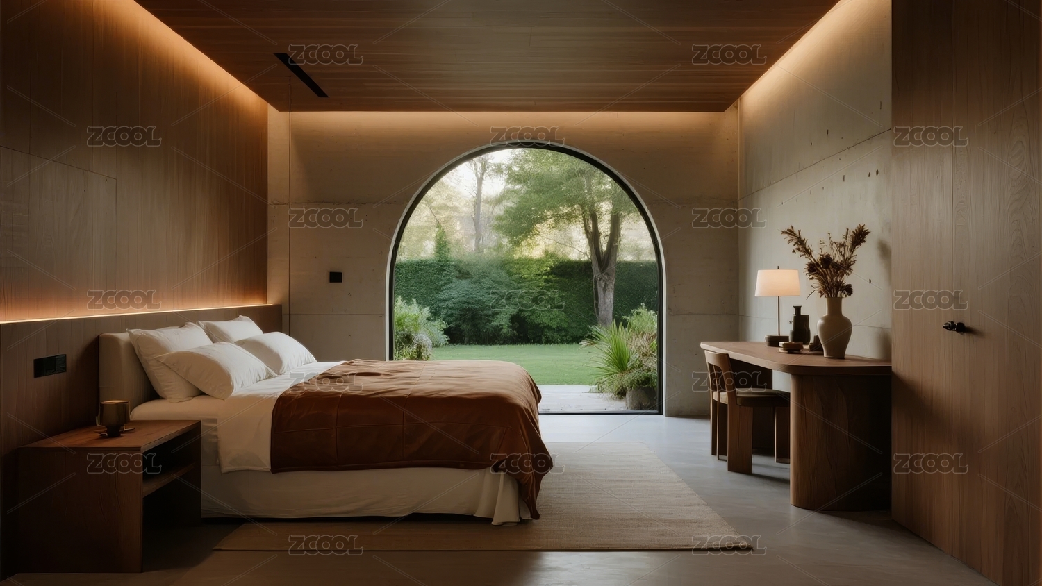 现代简约卧室,拱形窗景自然光