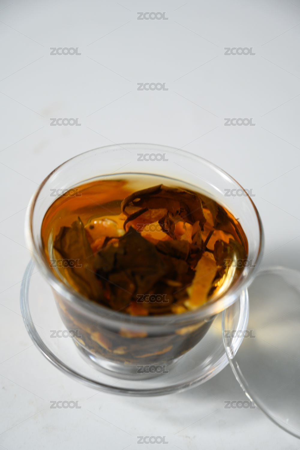 桌面上的杯子里的甘甜可口的陈皮白茶