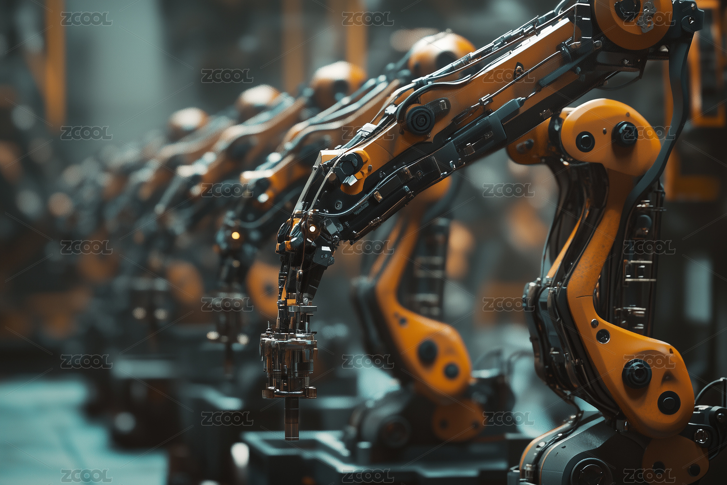 虚拟工厂车间整齐的机械手臂