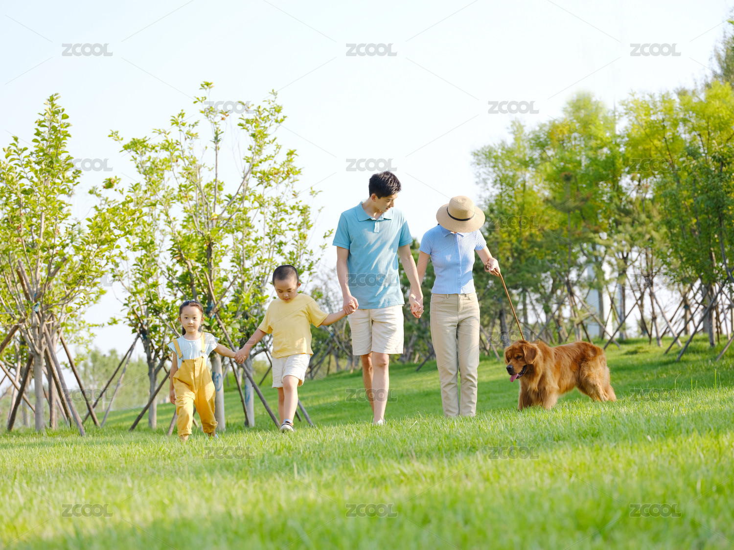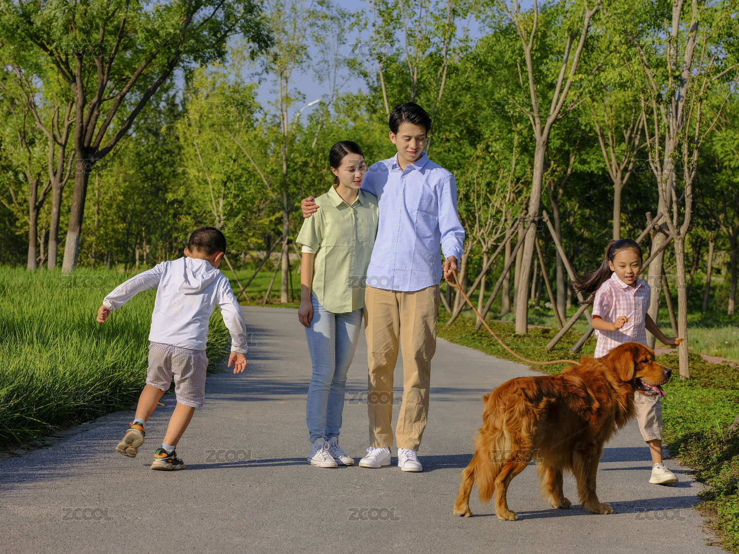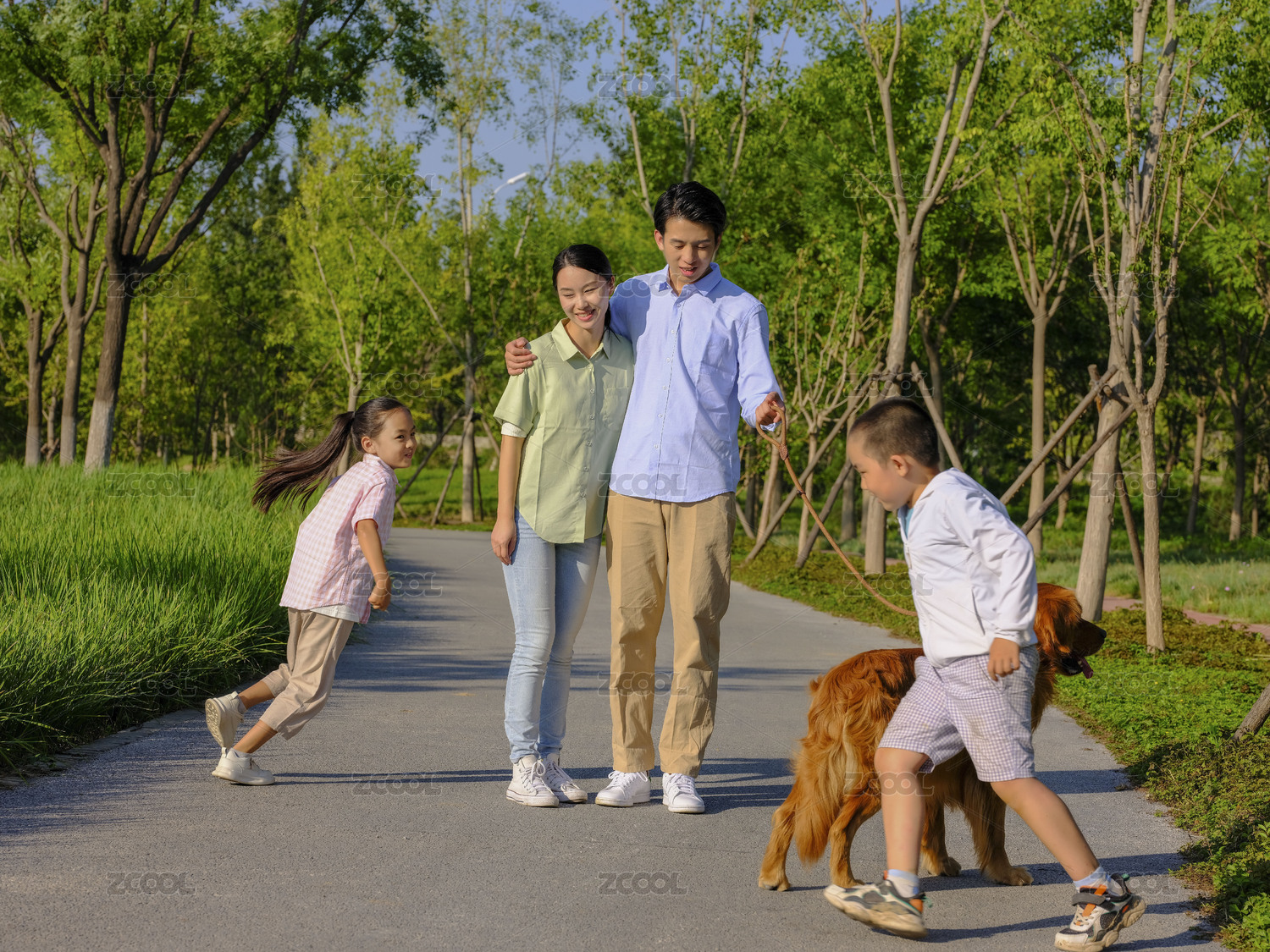 快乐的四口之家在公园遛狗