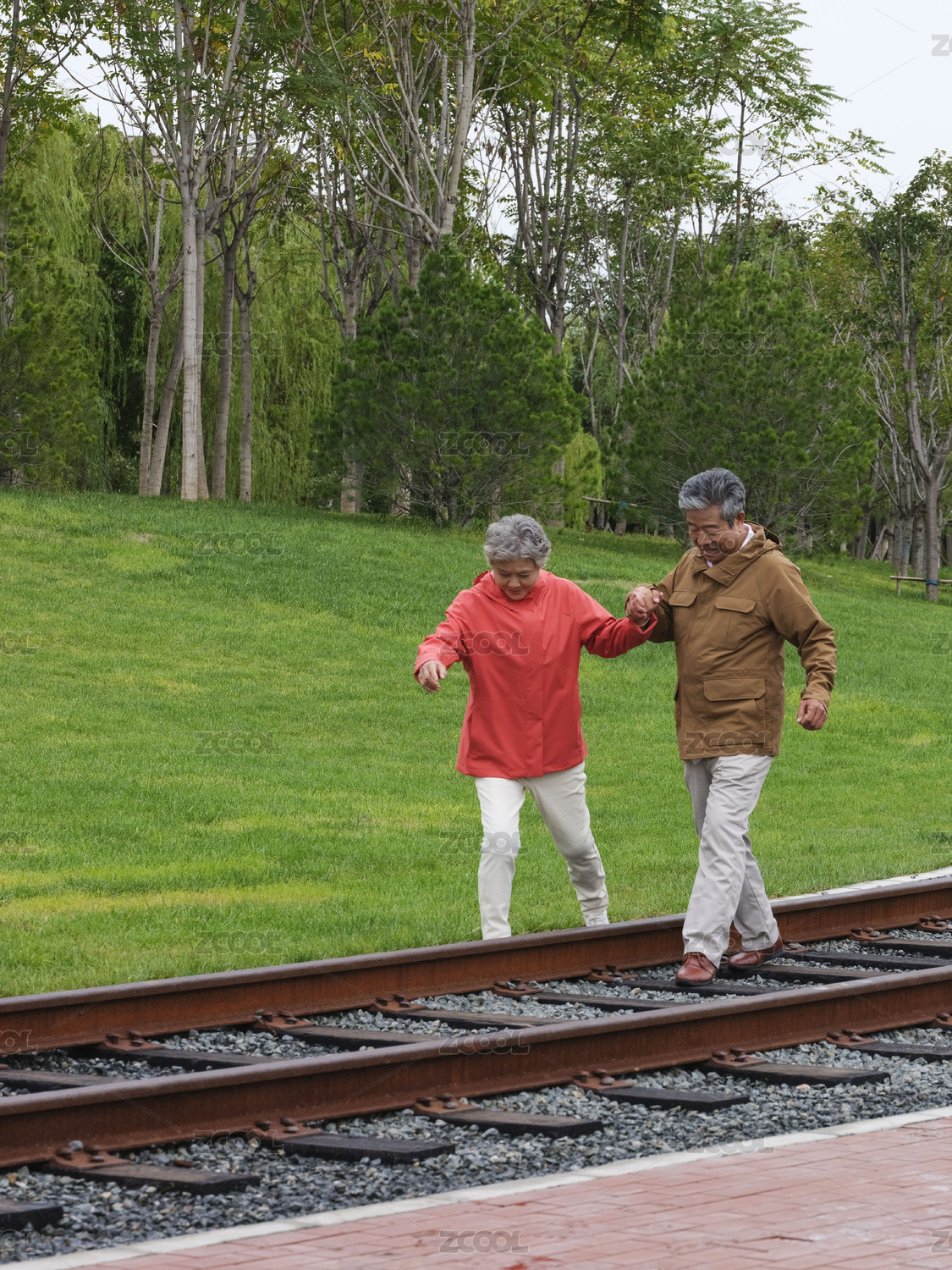 一对亚洲的老年夫妻在公园里散步