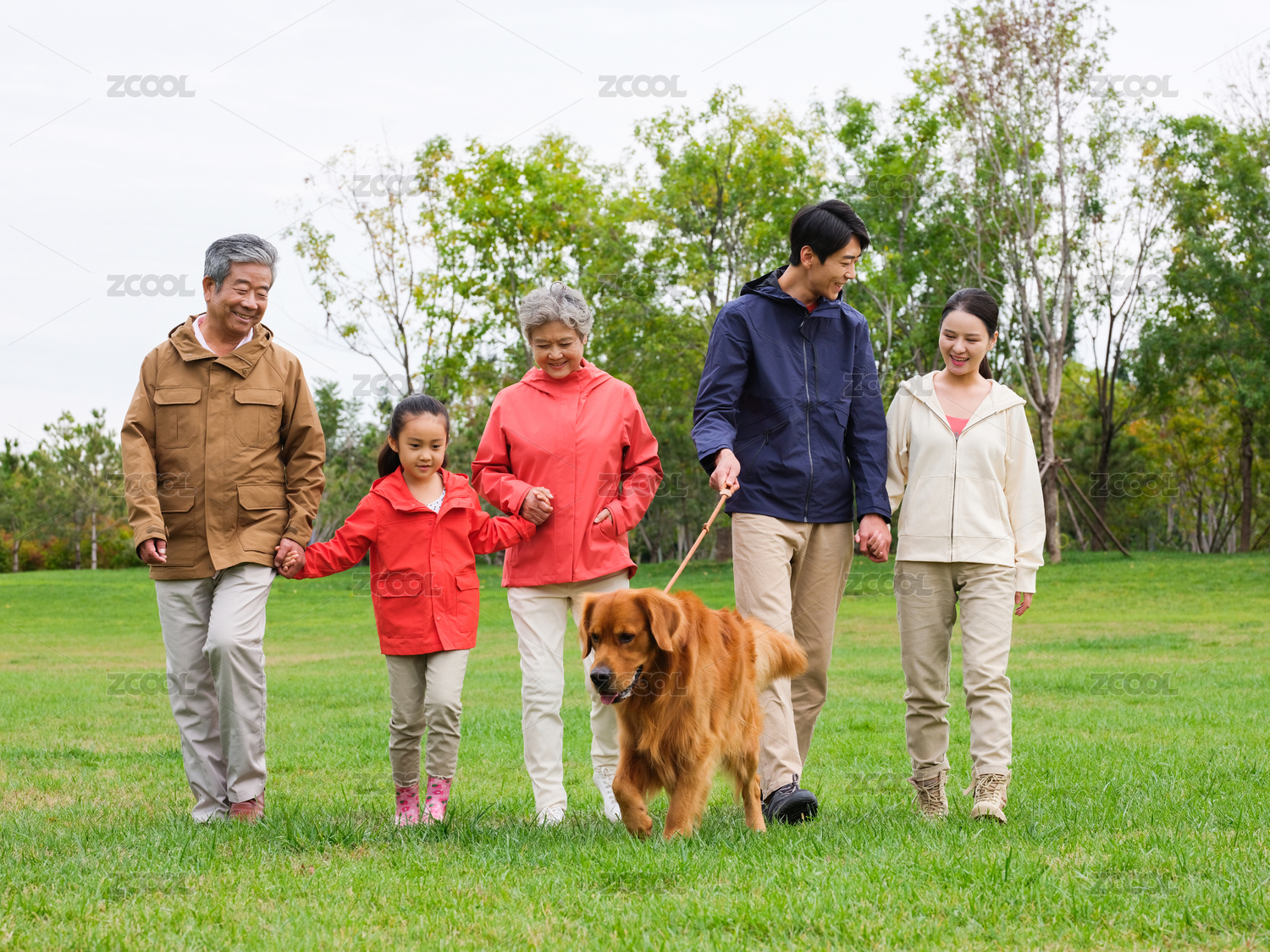 快乐的五口之家和宠物狗在公园散步