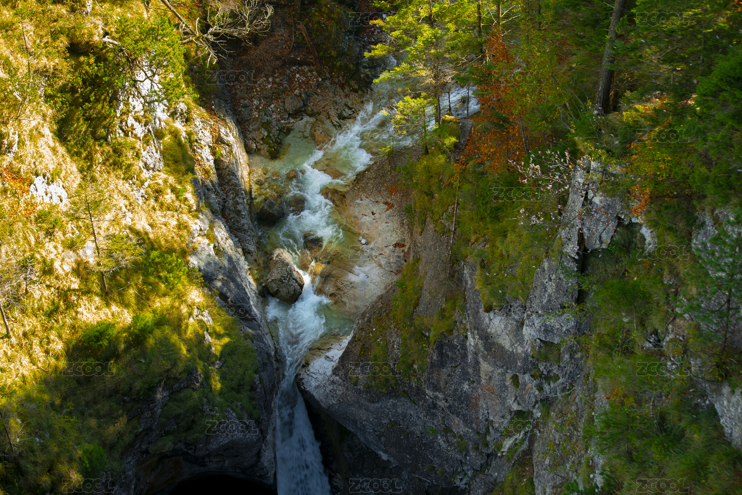 俯瞰德国新天鹅城堡枫红的山谷溪流