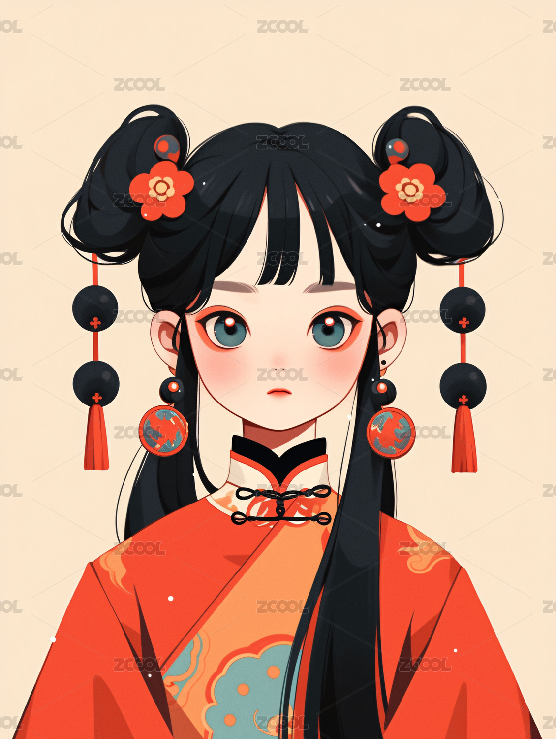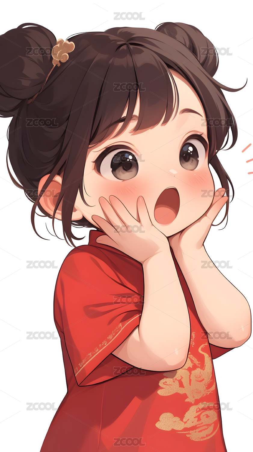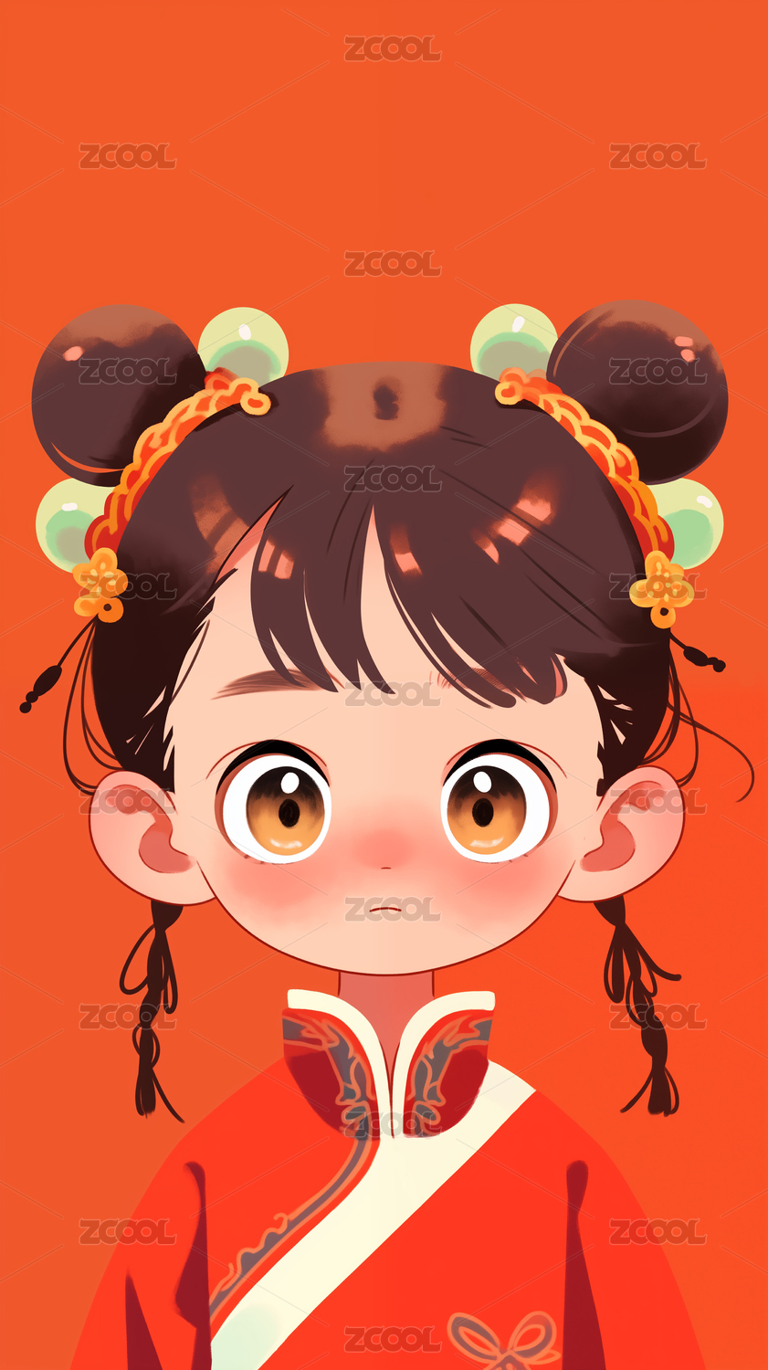 手绘卡通可爱的穿着红色唐装的女孩插画