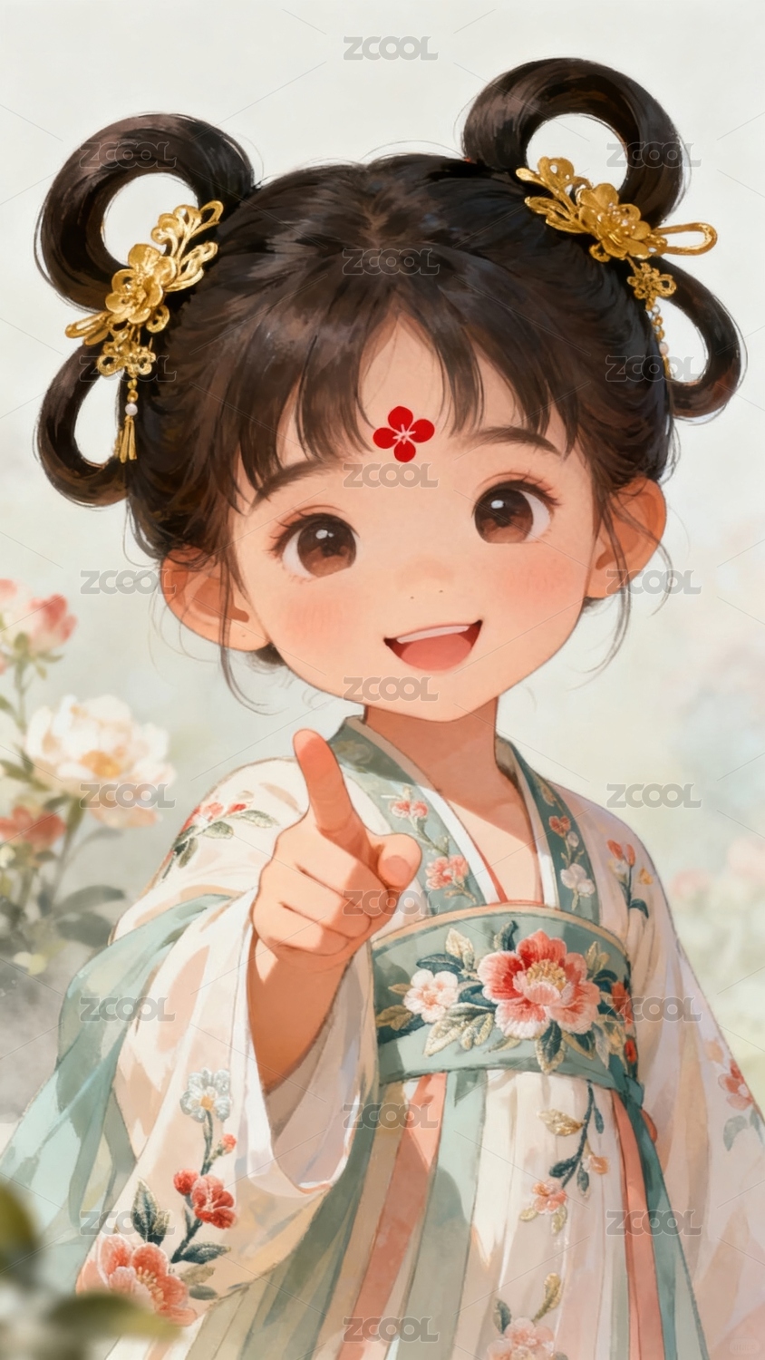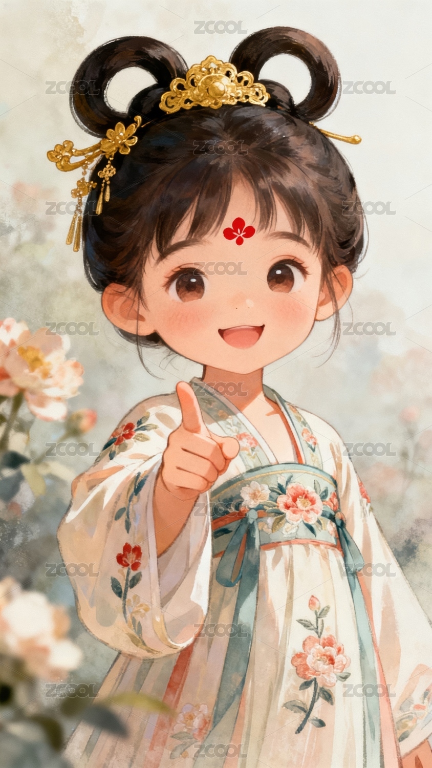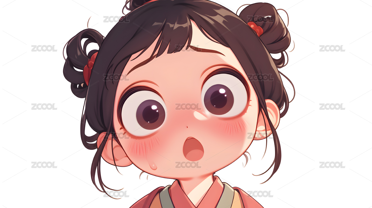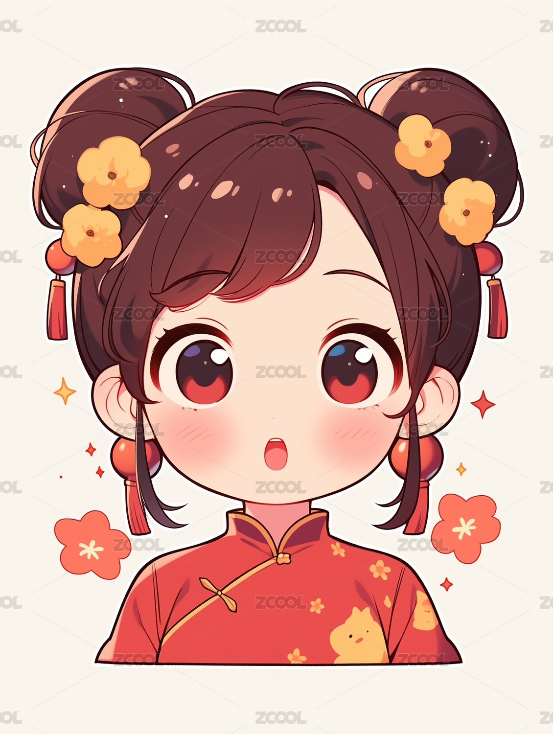 手绘卡通可爱的穿着红色唐装的女孩插画