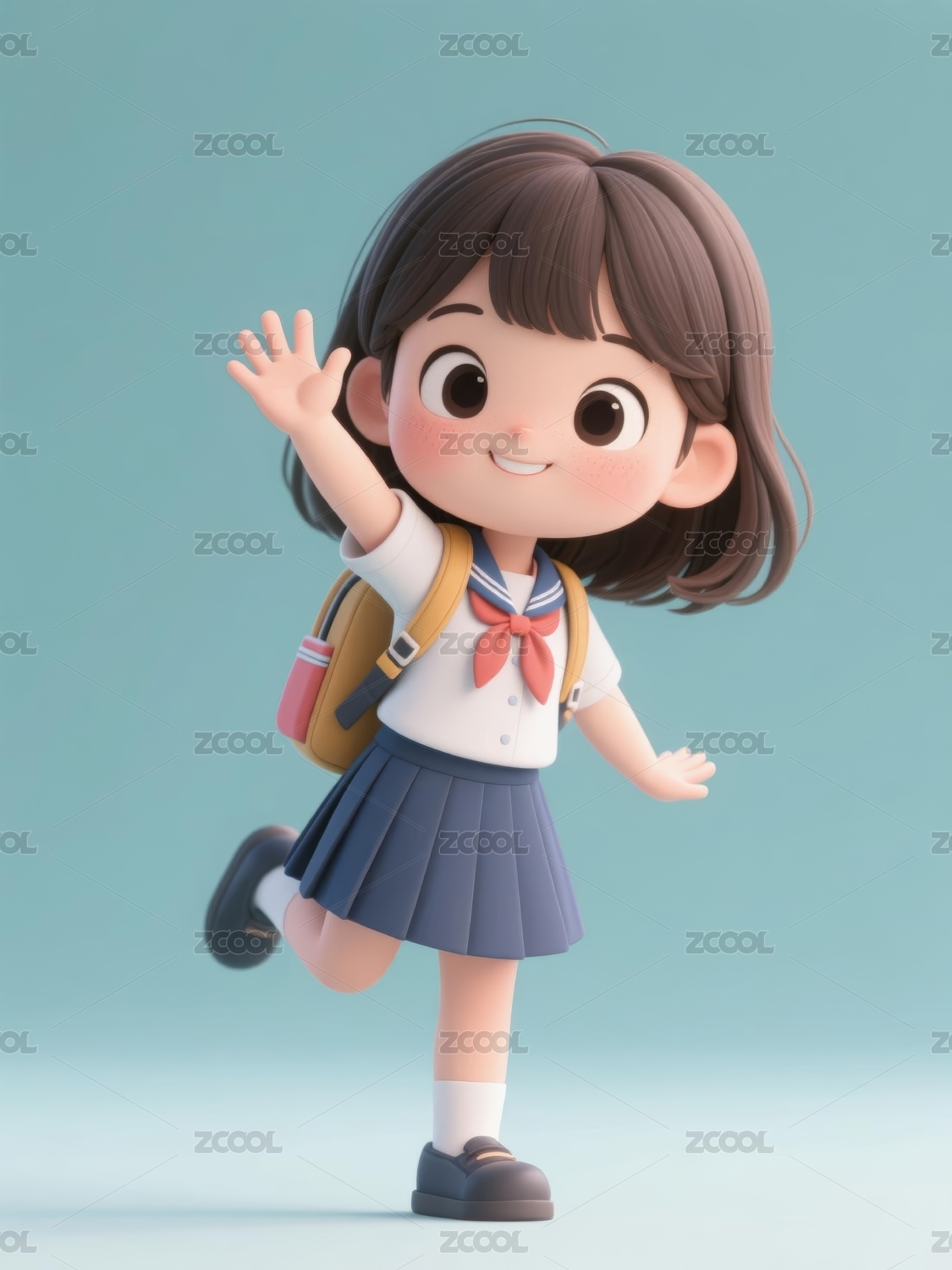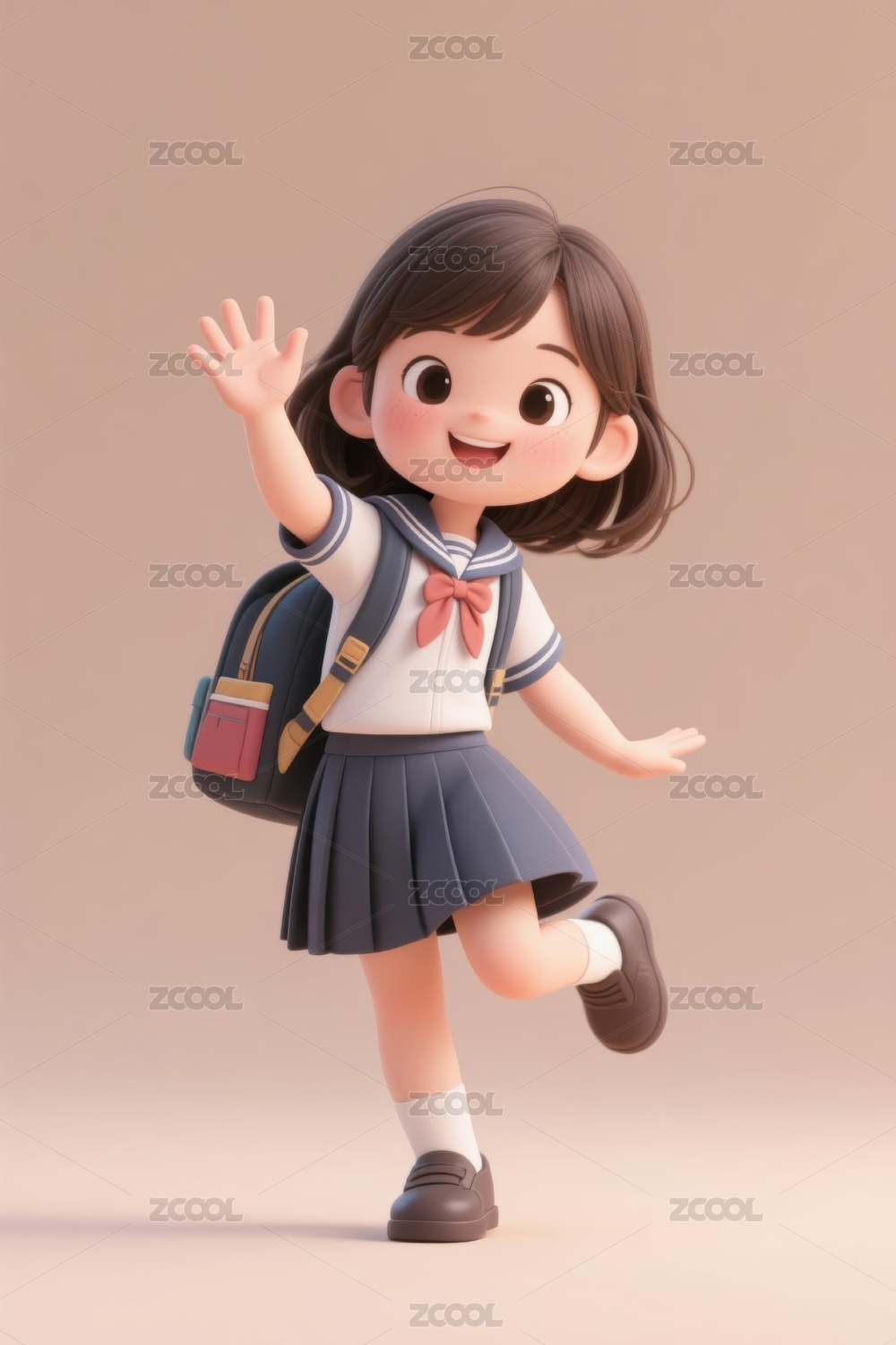 女孩,书包,可爱,红色,奔跑,白色校服,蓝色裙子,书籍,秋天,落叶