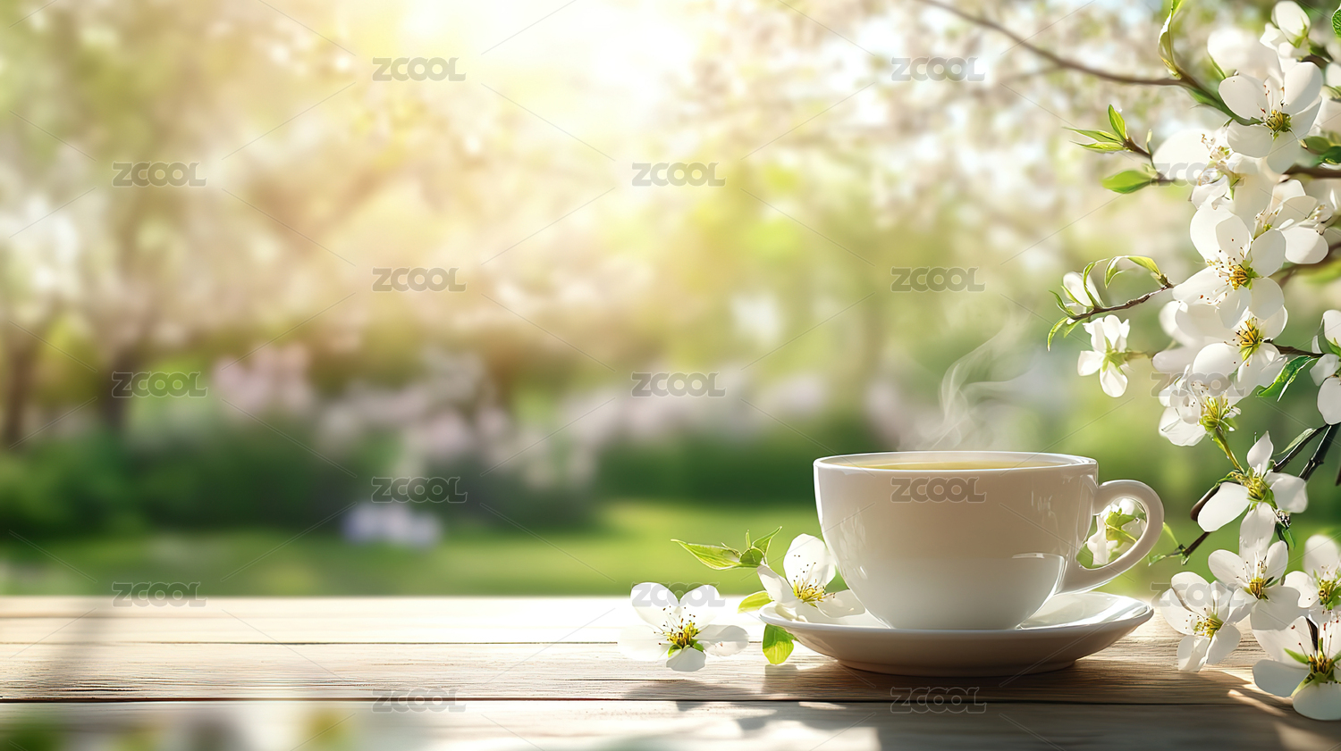 室外的樱花衬托着室内飘窗下的书和咖啡