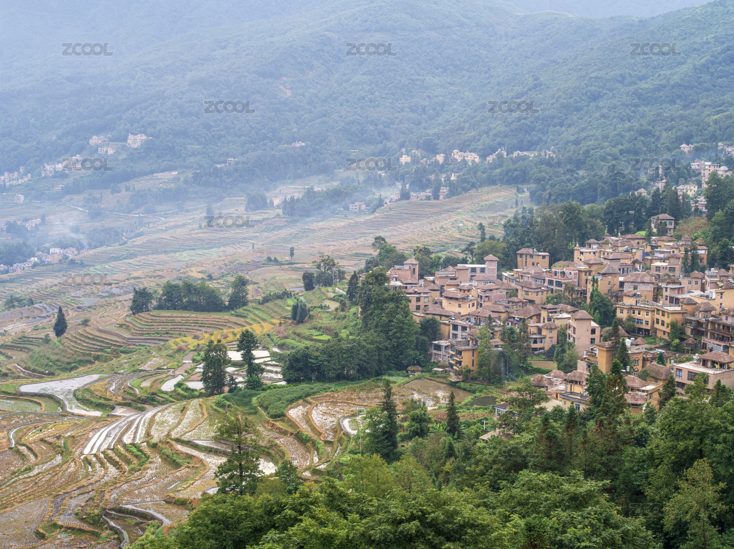 中国贵州省从江县加榜梯田风光,梯田环绕的村寨