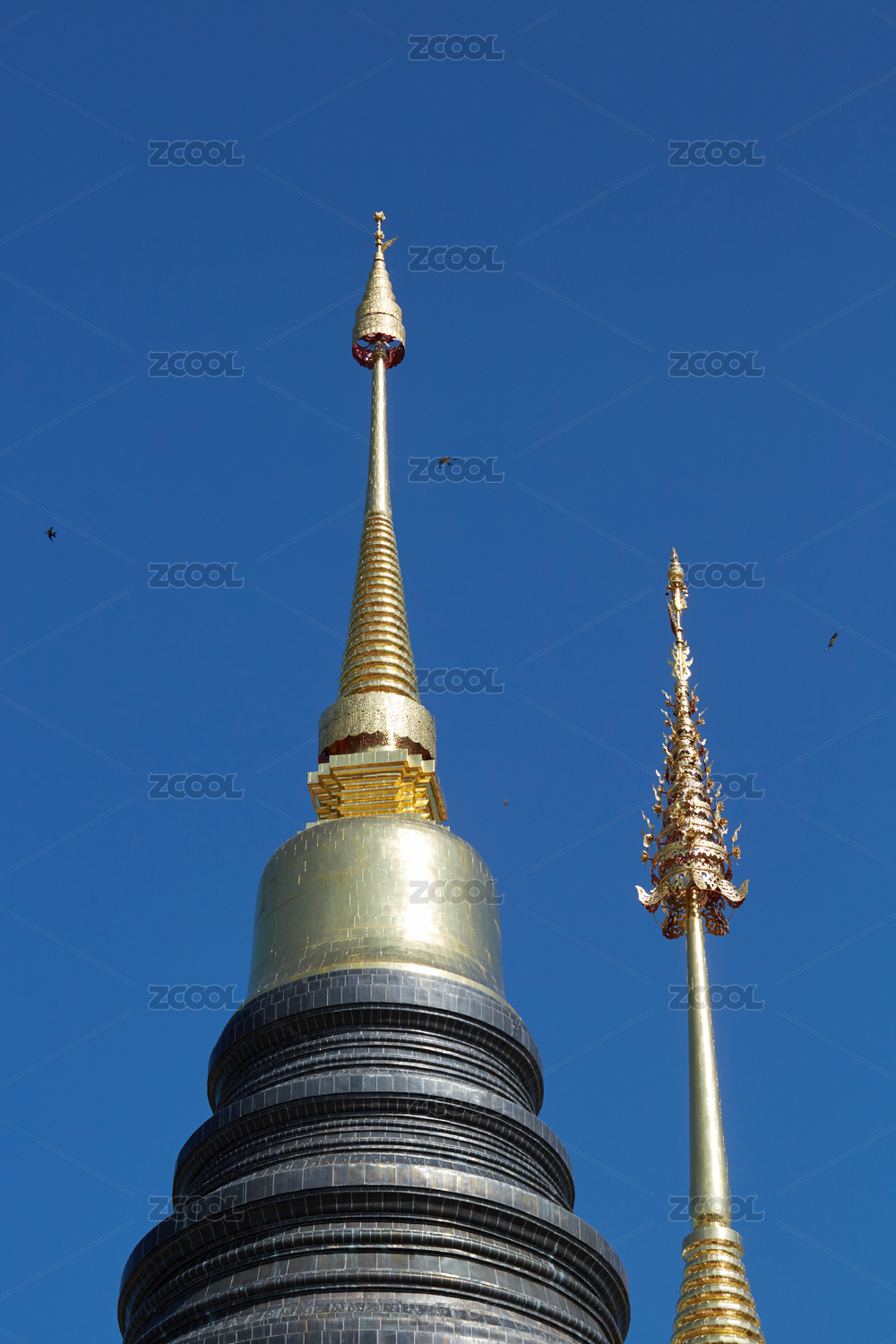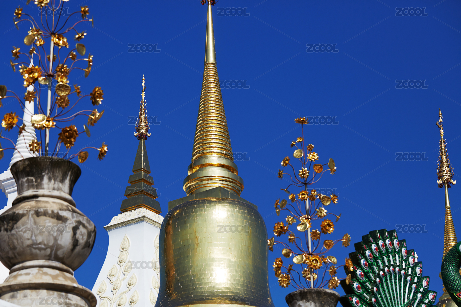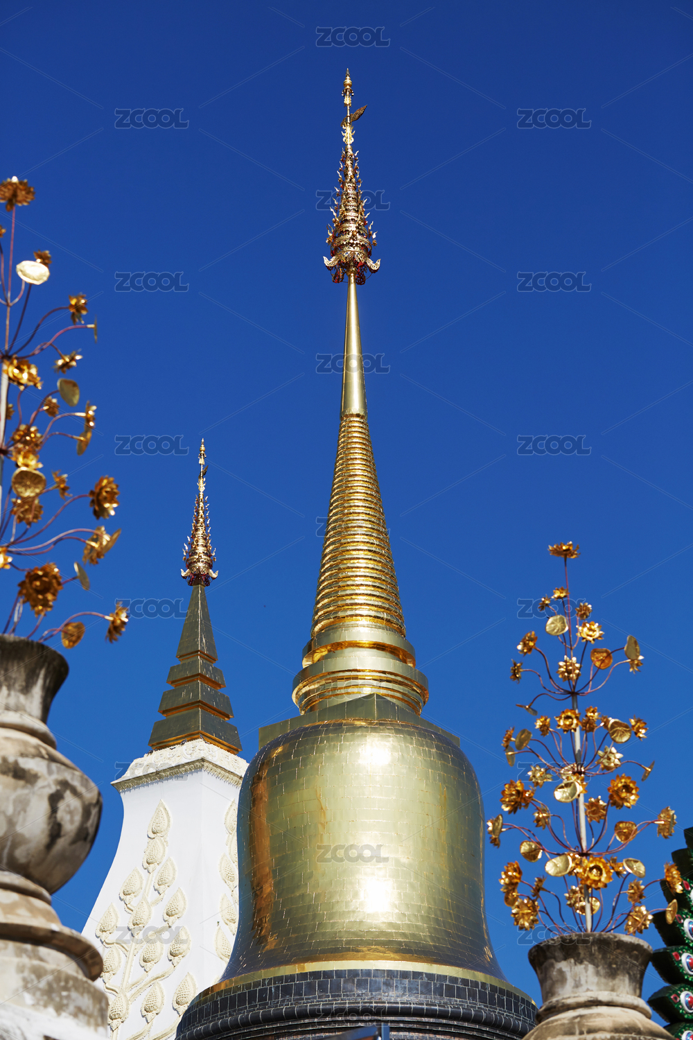 神圣佛教寺庙大门的宁静景象与金色尖顶