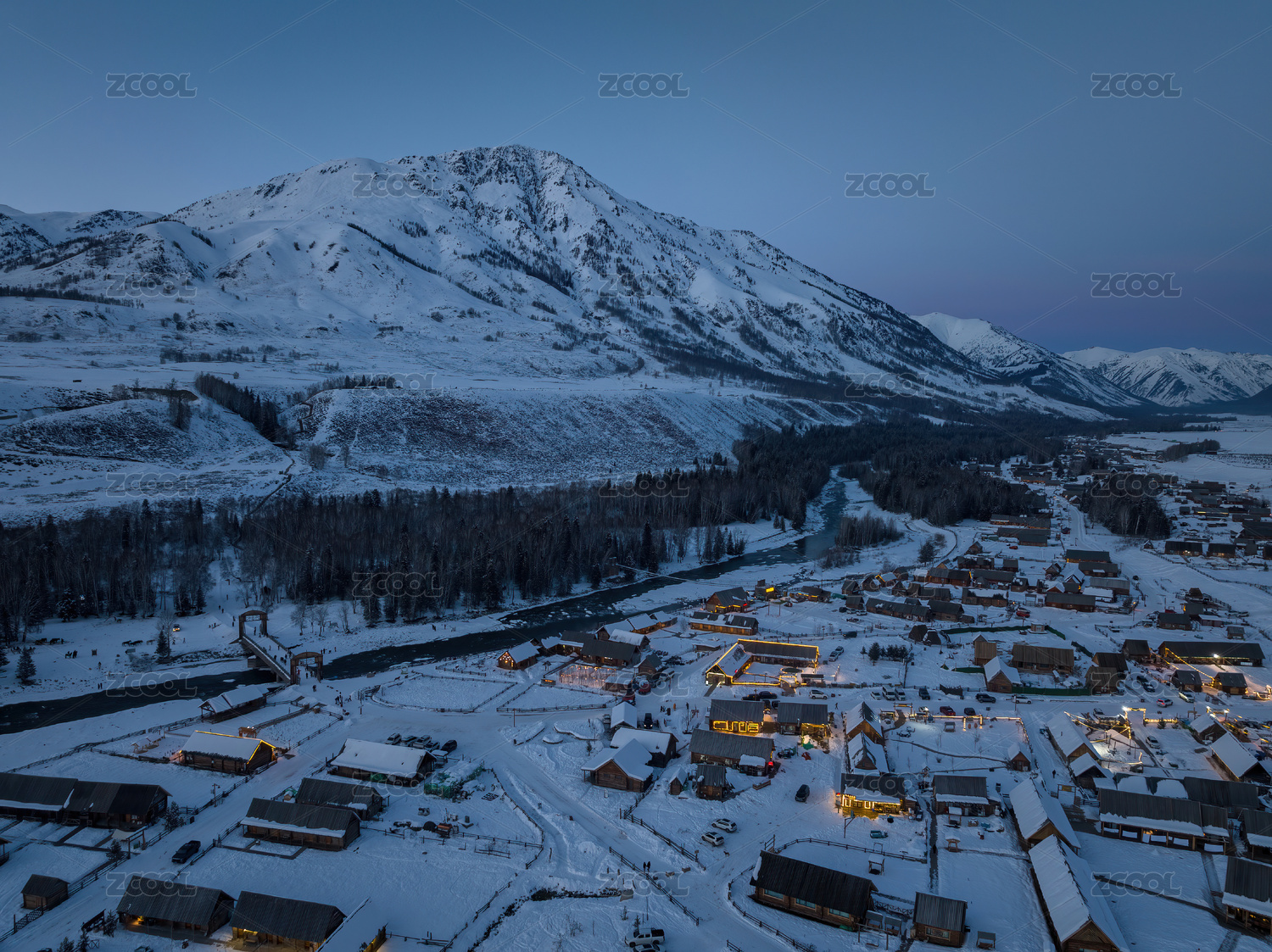 中国航拍冬季新疆禾木村庄房屋白雪皑皑