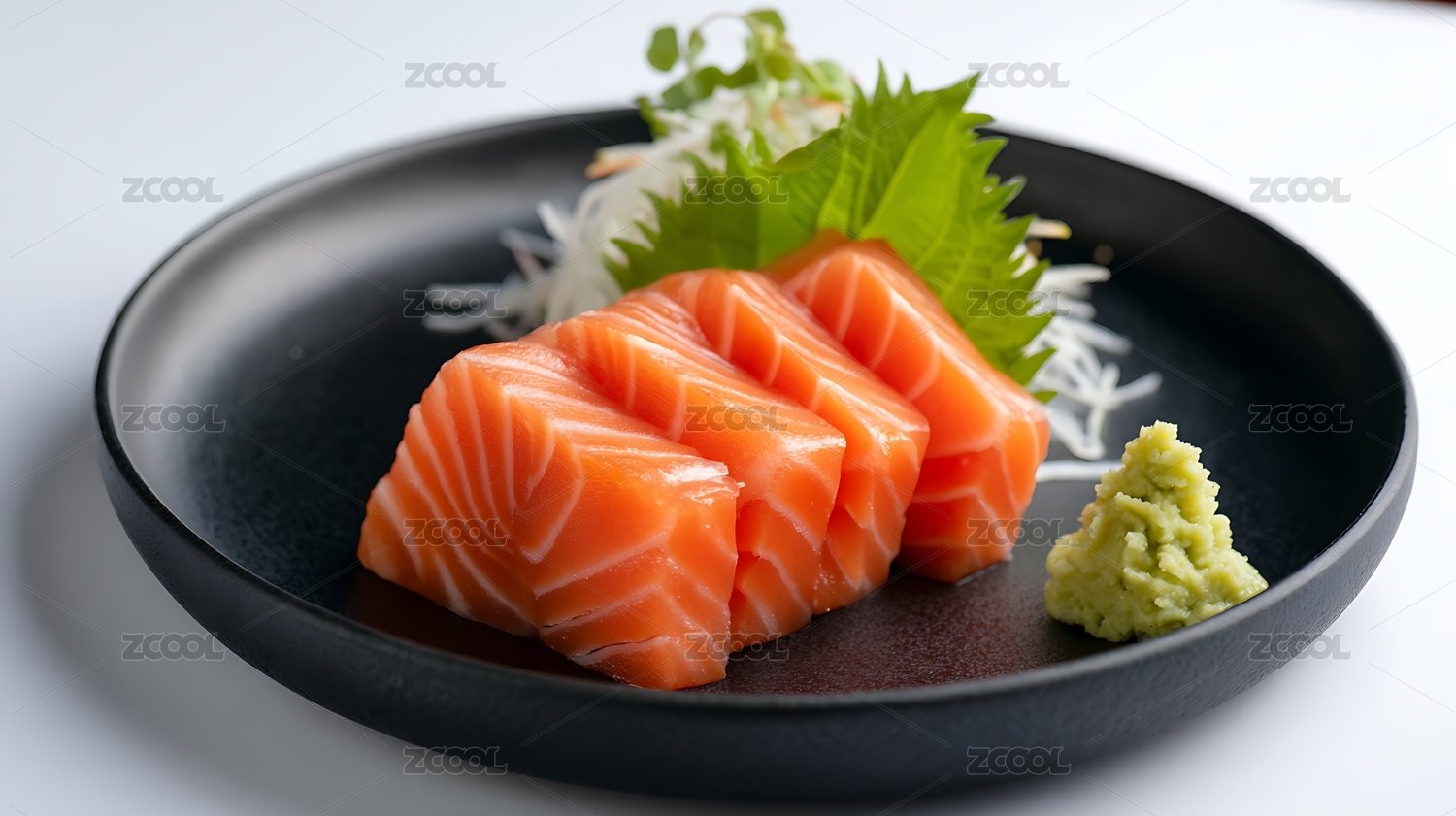 日本料理新鲜的三文鱼生鱼片和一碗蘸料特写