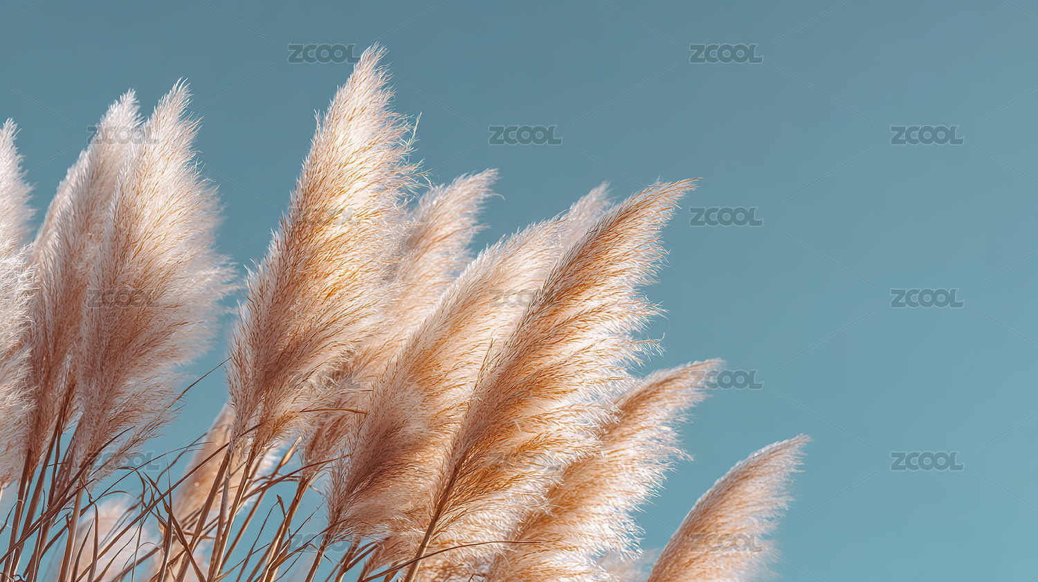 毛茸茸的芦苇植物在蓝天背景下绽放