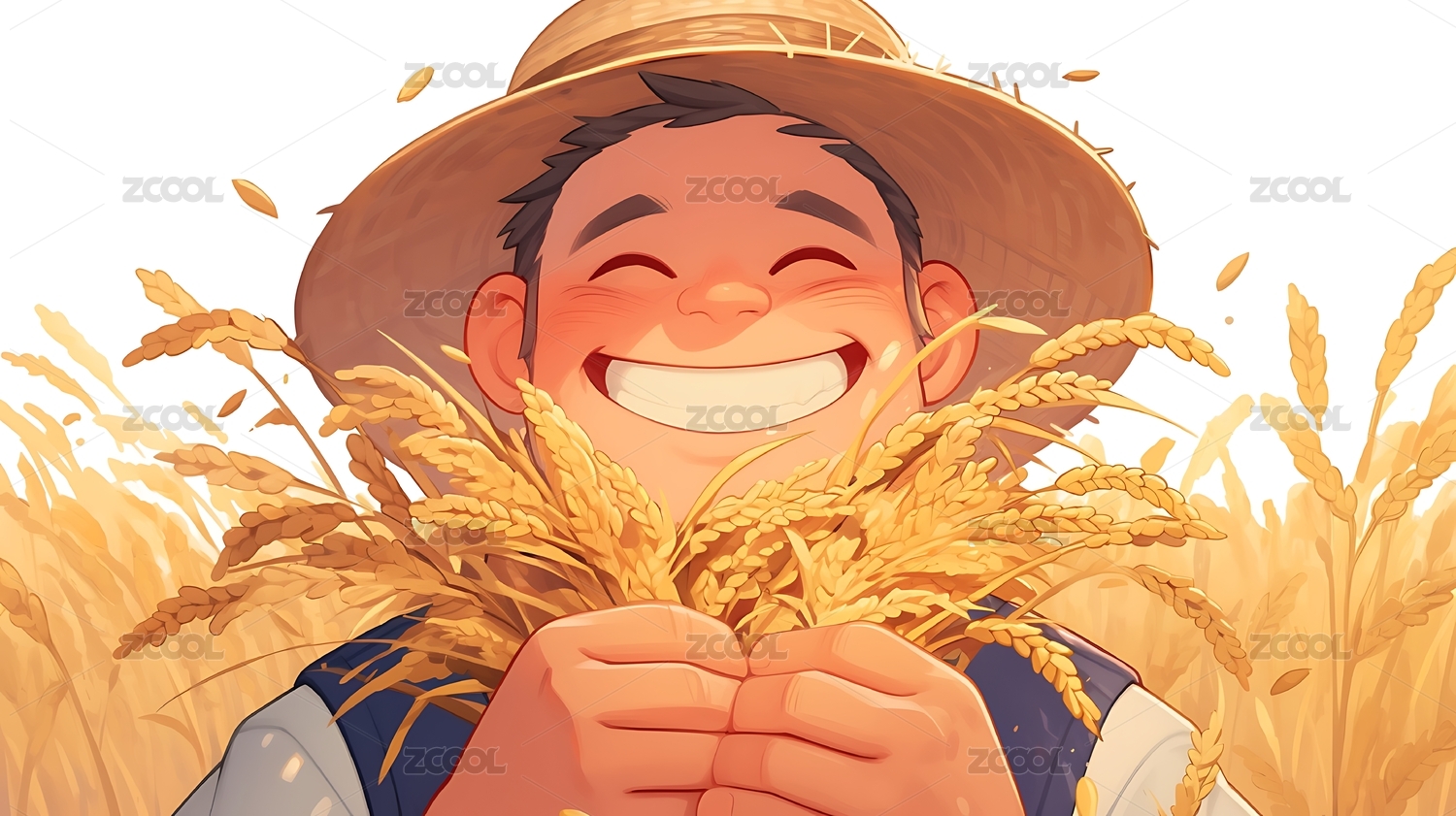 戴草帽抱稻穗的农民