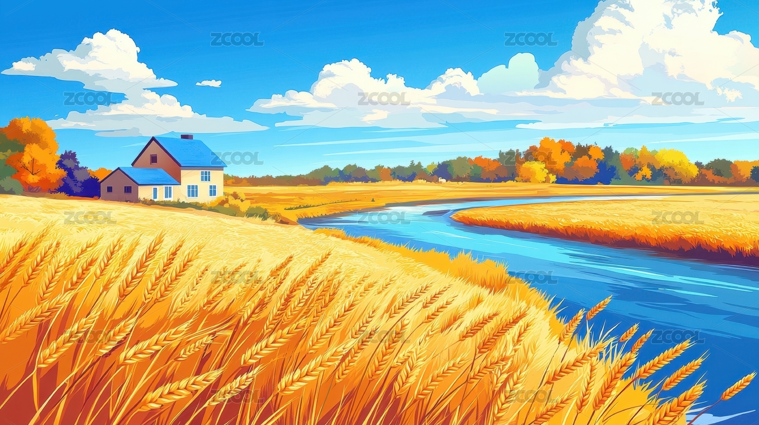 AIGC202402,秋天,立秋,秋分,节气,麦子,秋收,卡通,插画,小麦