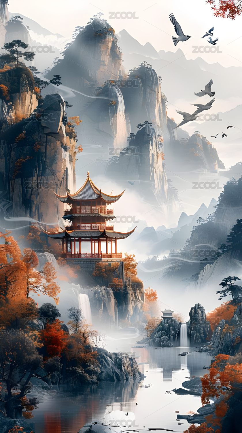 AIGCFG,中国风,中式,国潮风,插画,风景,建筑,秋天,枫叶