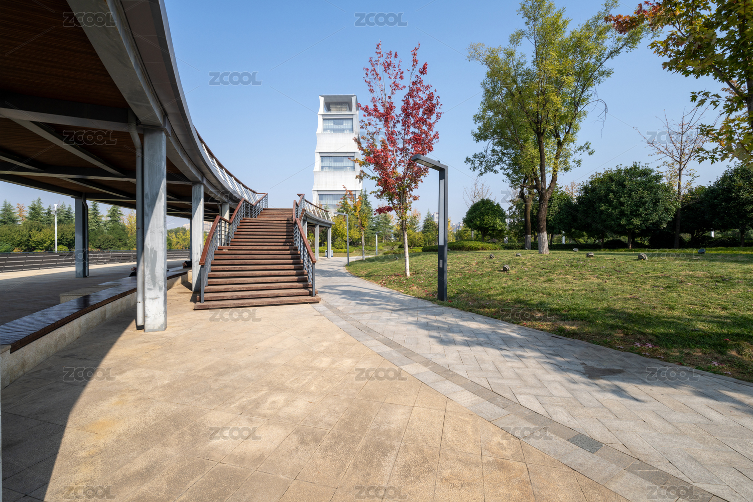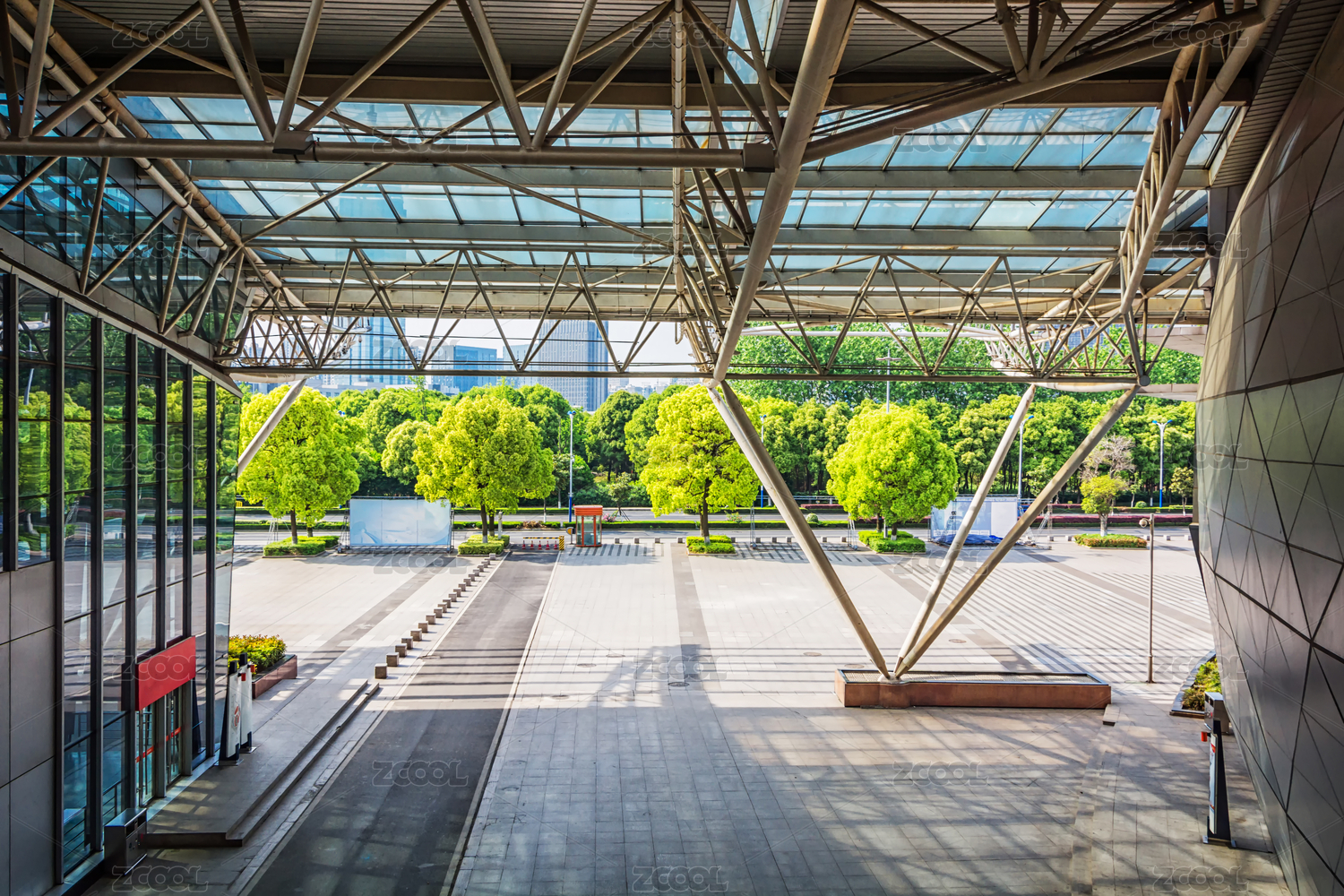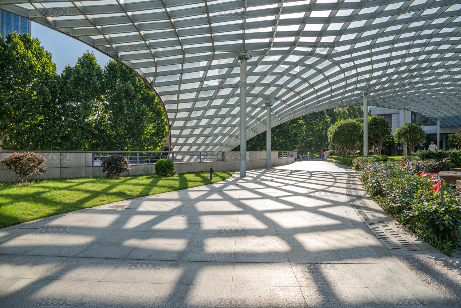 美丽的公园和玻璃天幕在一个阳光灿烂的日子