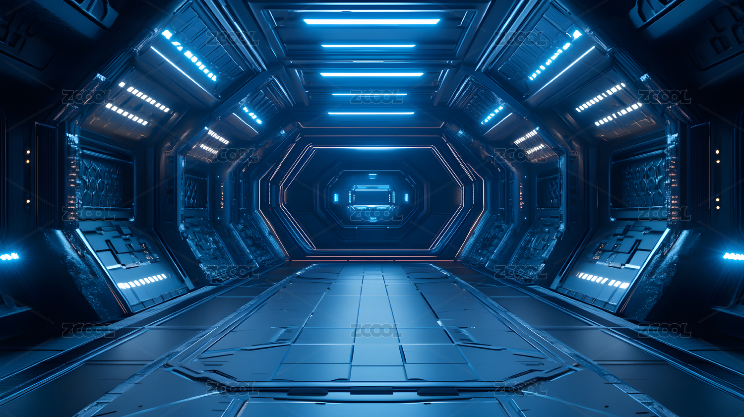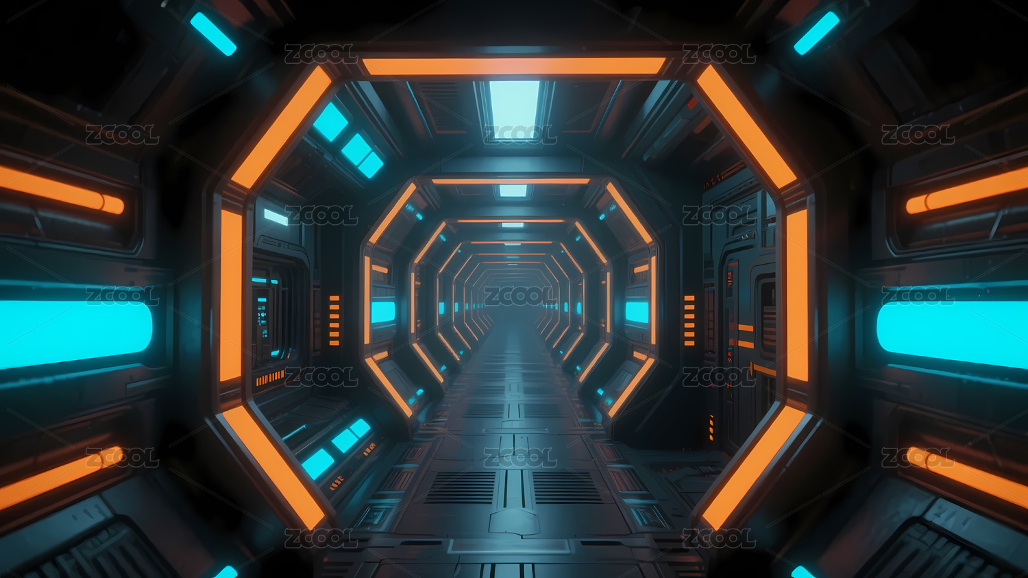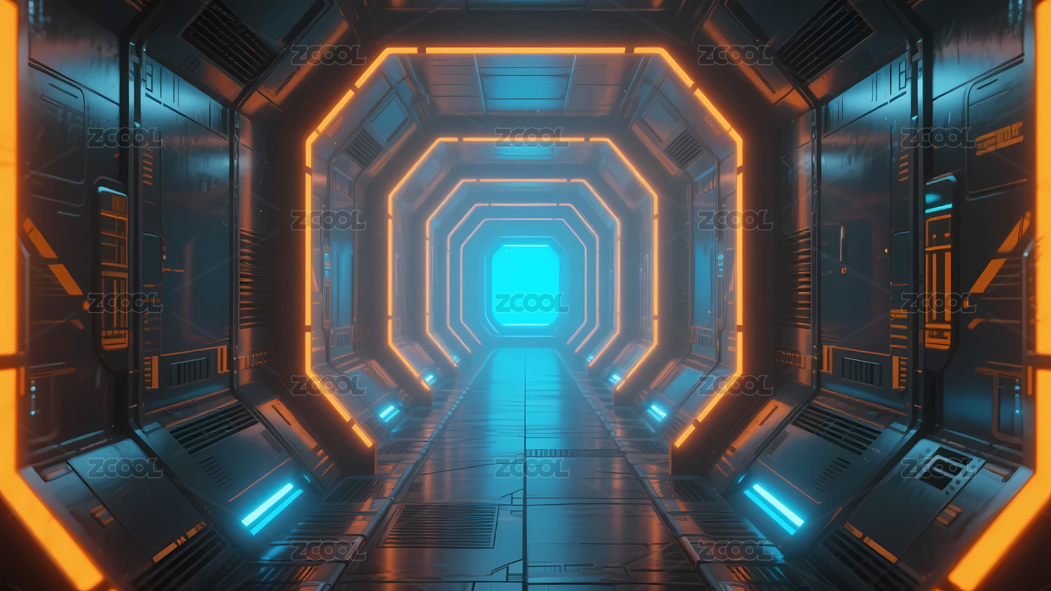 科幻,未来,科技,灯光,隧道,走廊,通道,蓝光,橙光,金属