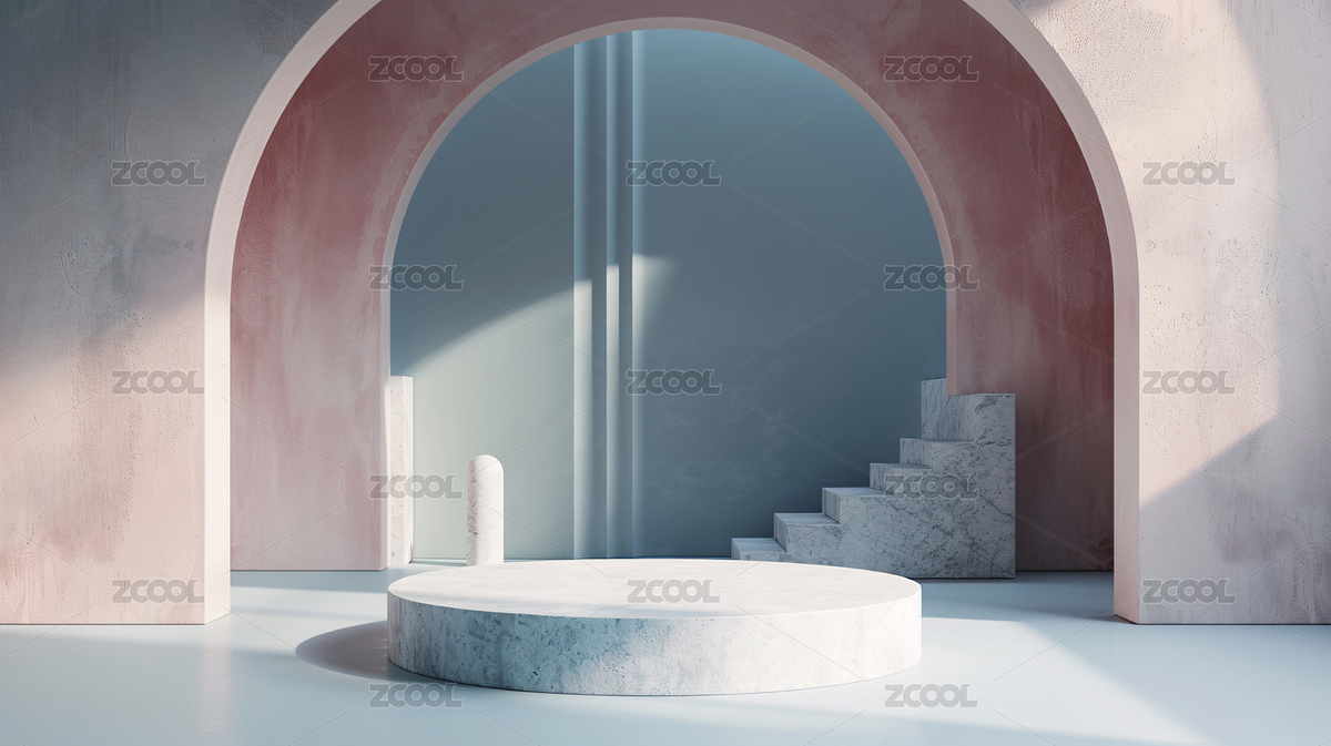 三维渲染的灰黄色圆形拱门几何体展台背景