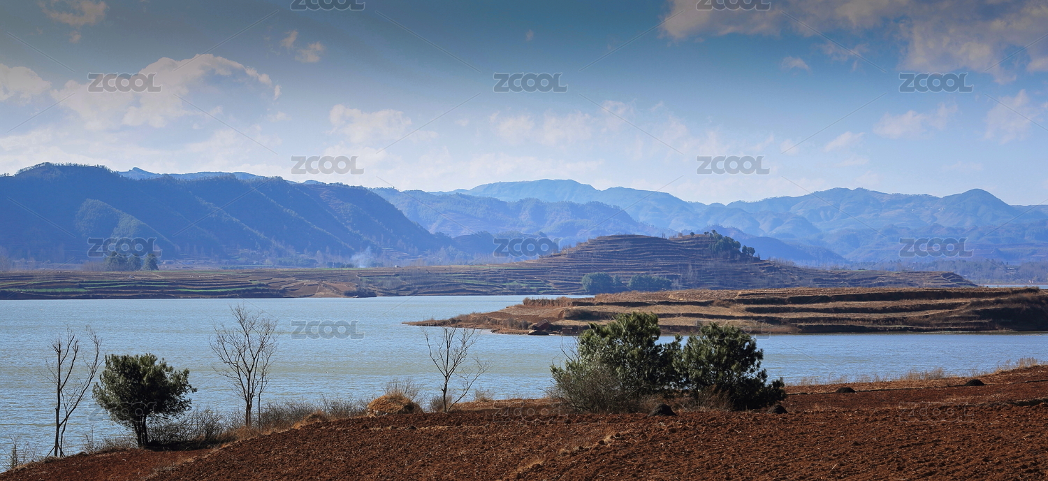 云南会泽大桥镇蓝天白云山脉湖泊自然风光