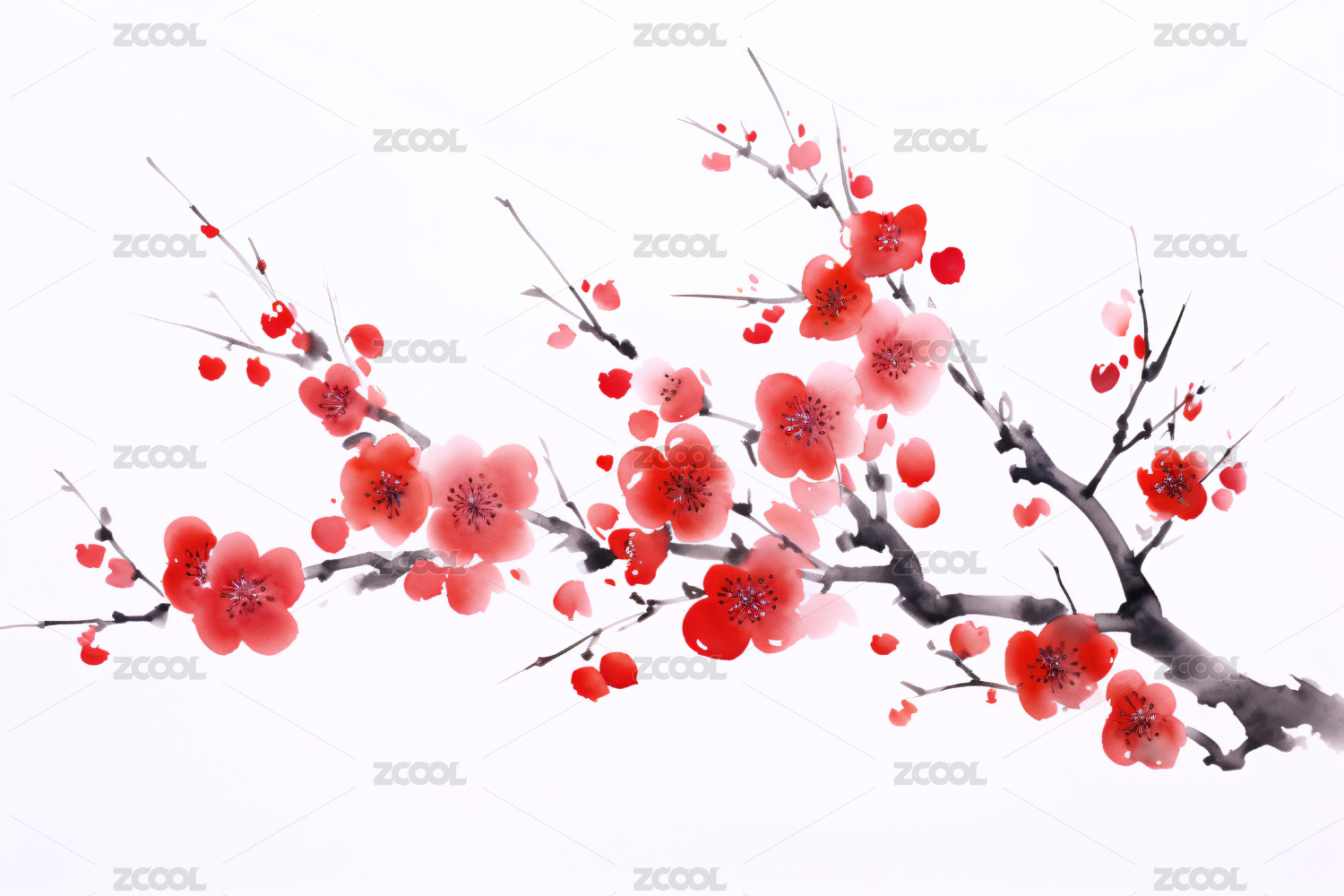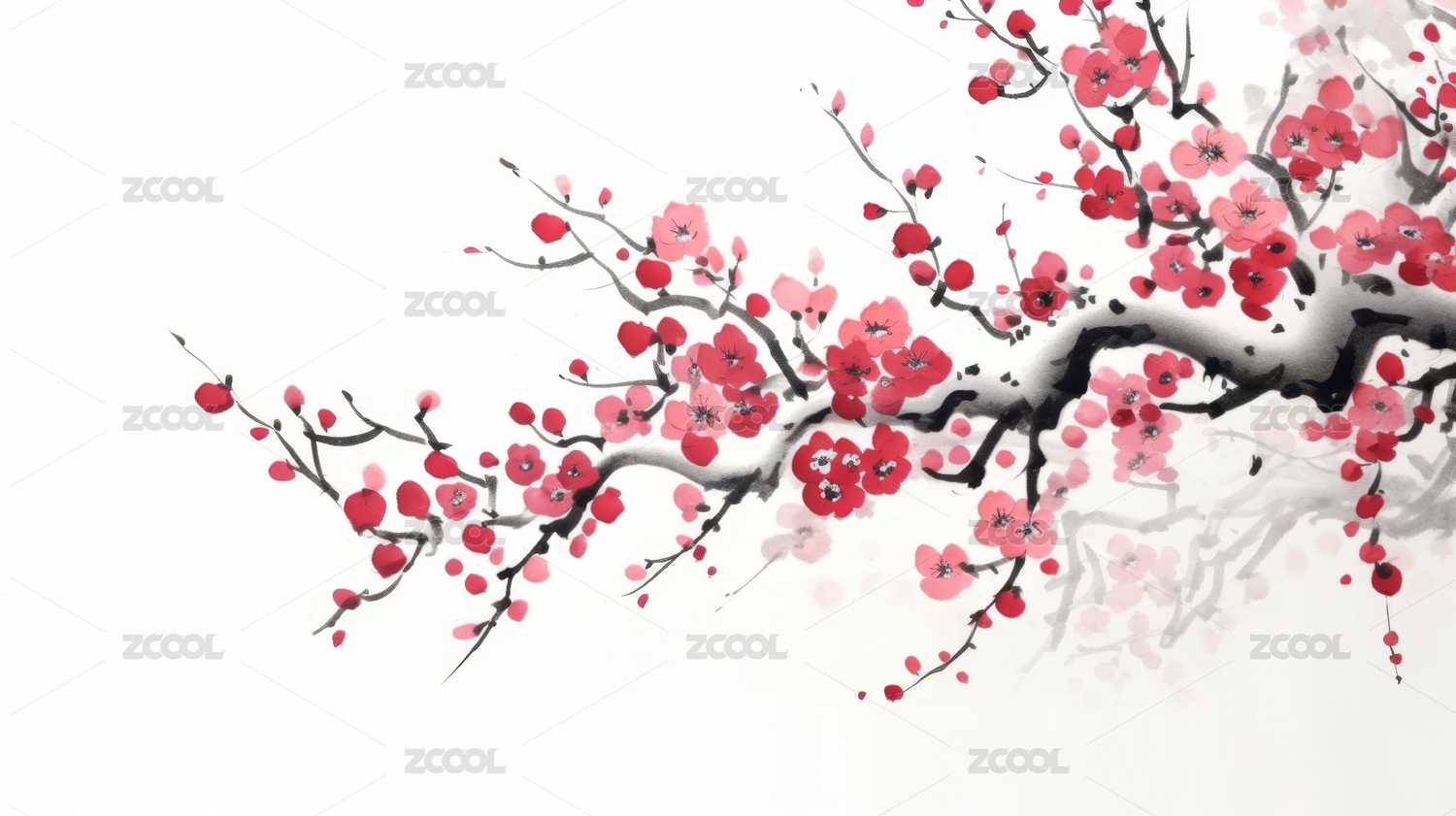 盛开的桃花花枝,水墨风手绘水彩插画素材