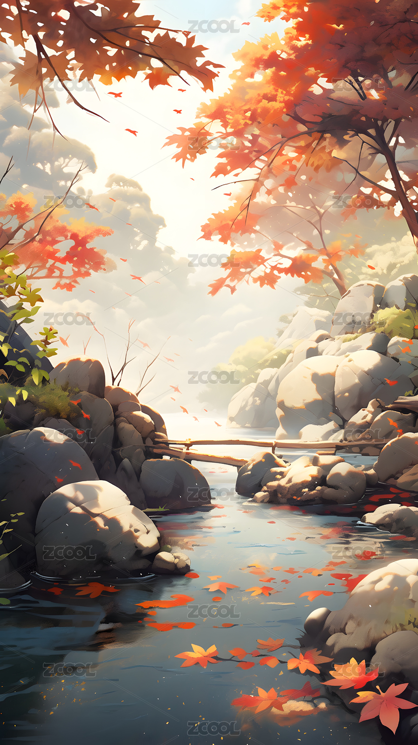 暖色春天鲜花盛开山间小溪3D卡通立体插画