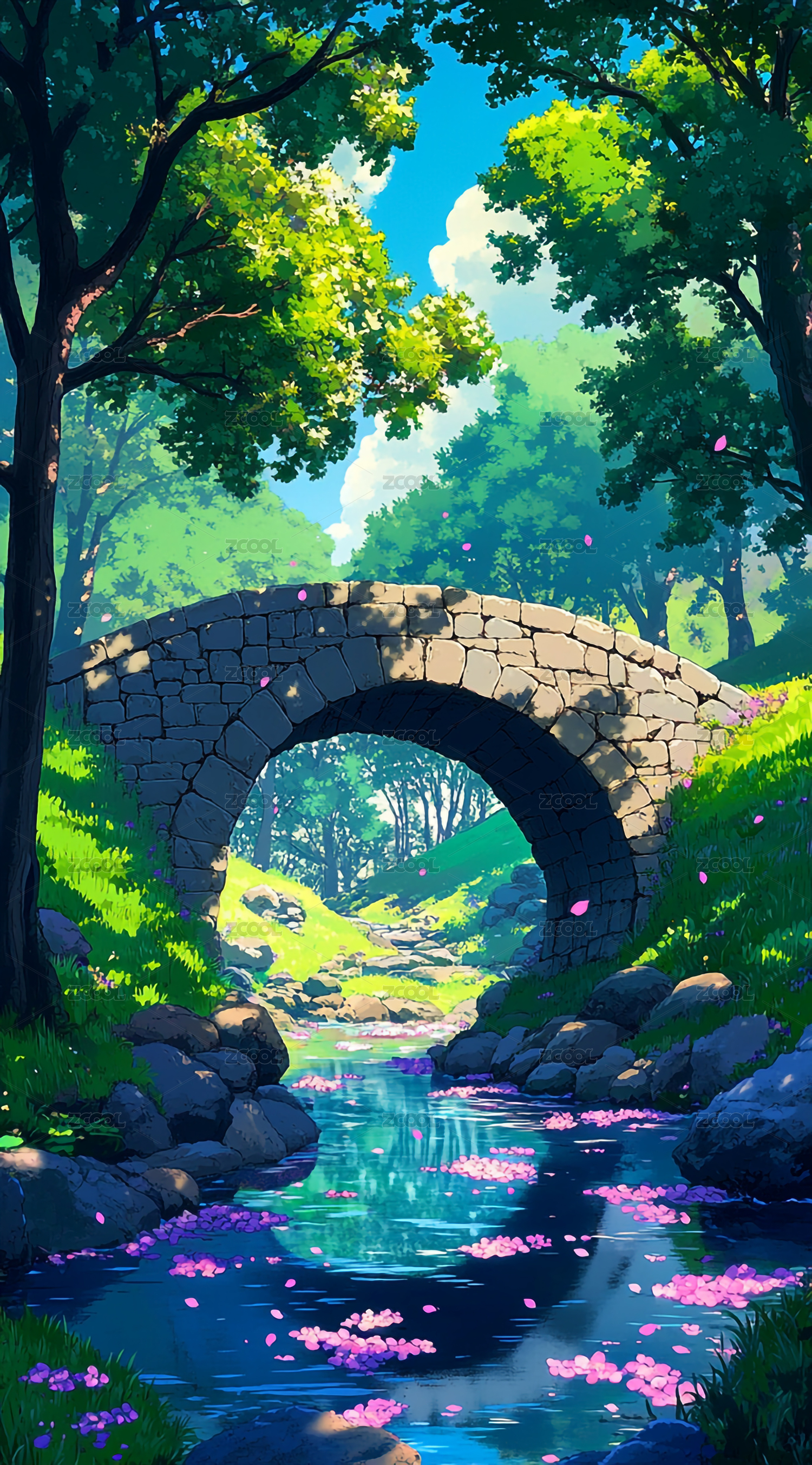 长苔藓毛绒植物的仙境小桥小河3D卡通插画