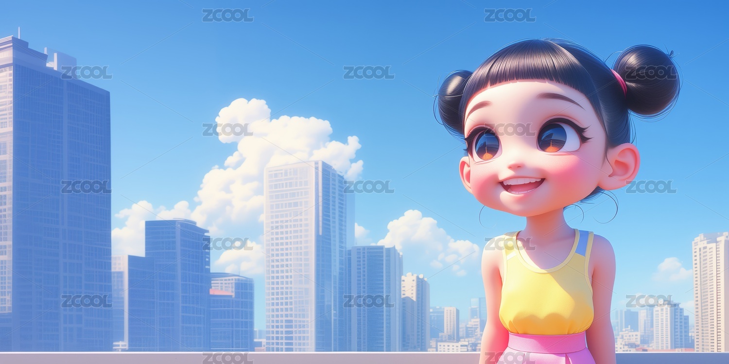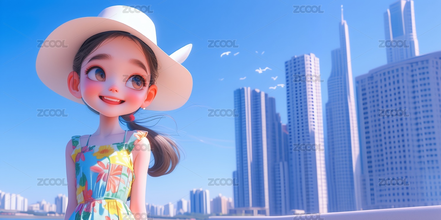 夏天室外可爱大眼睛微笑小女孩3D卡通插画