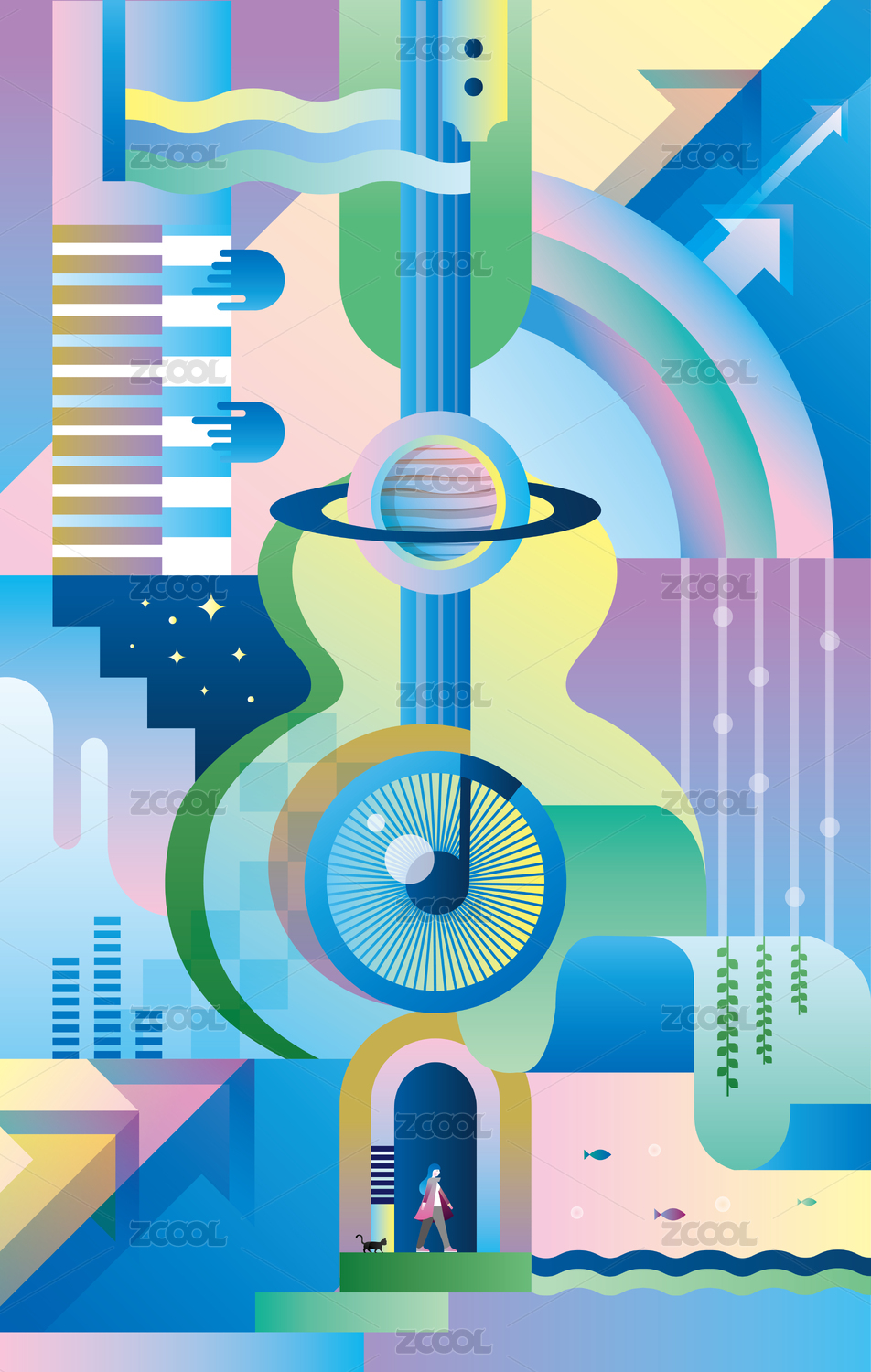 在宇宙中旅行的少女和猫抽象几何插画