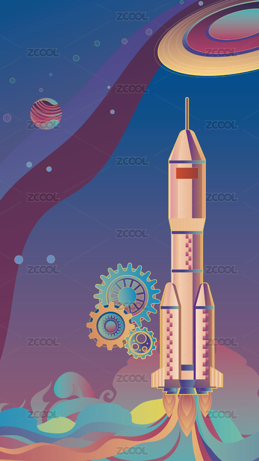太空星球火箭升空齿轮科技矢量插画竖幅