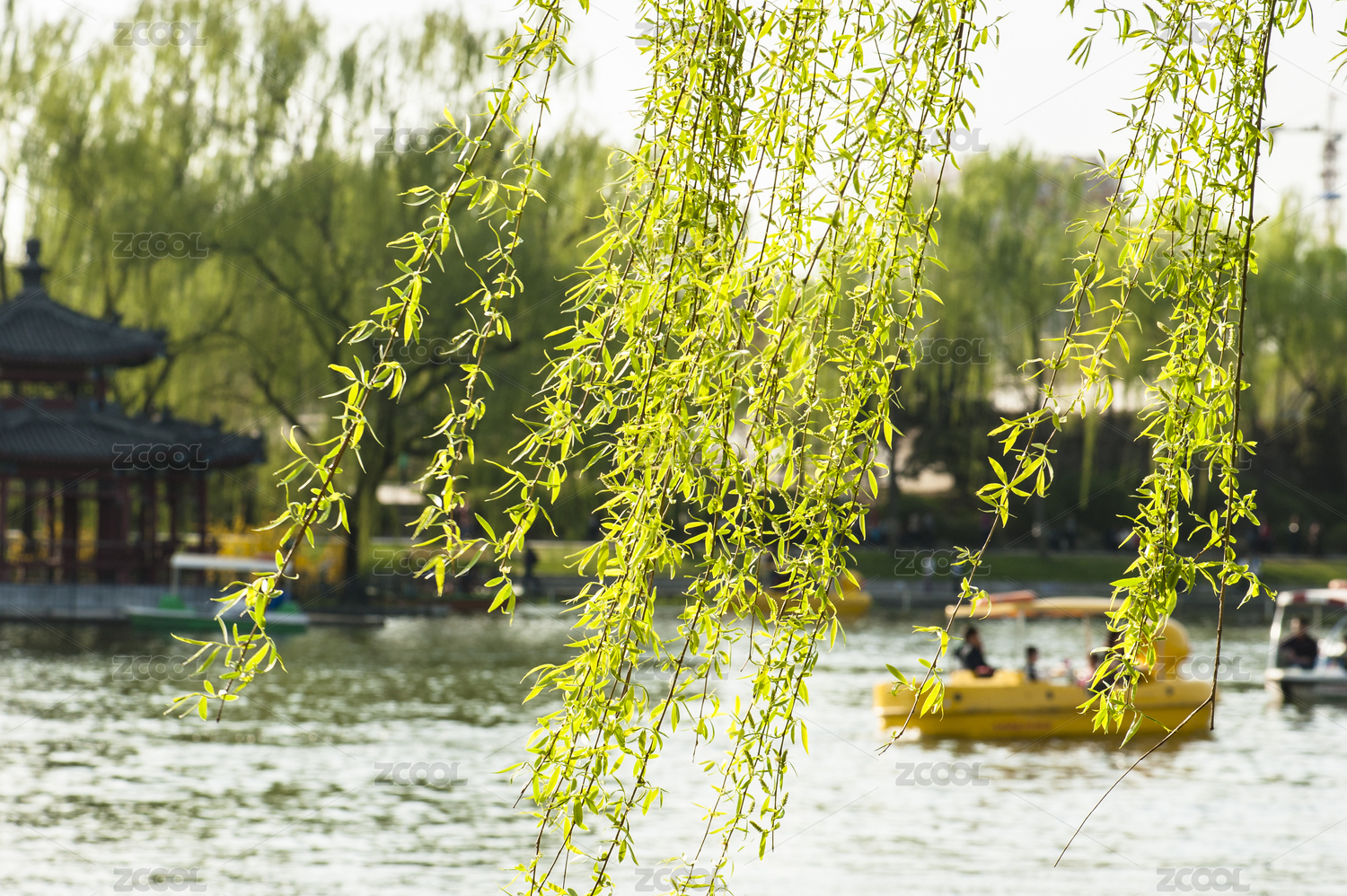 春天柳树垂下绿色的枝条