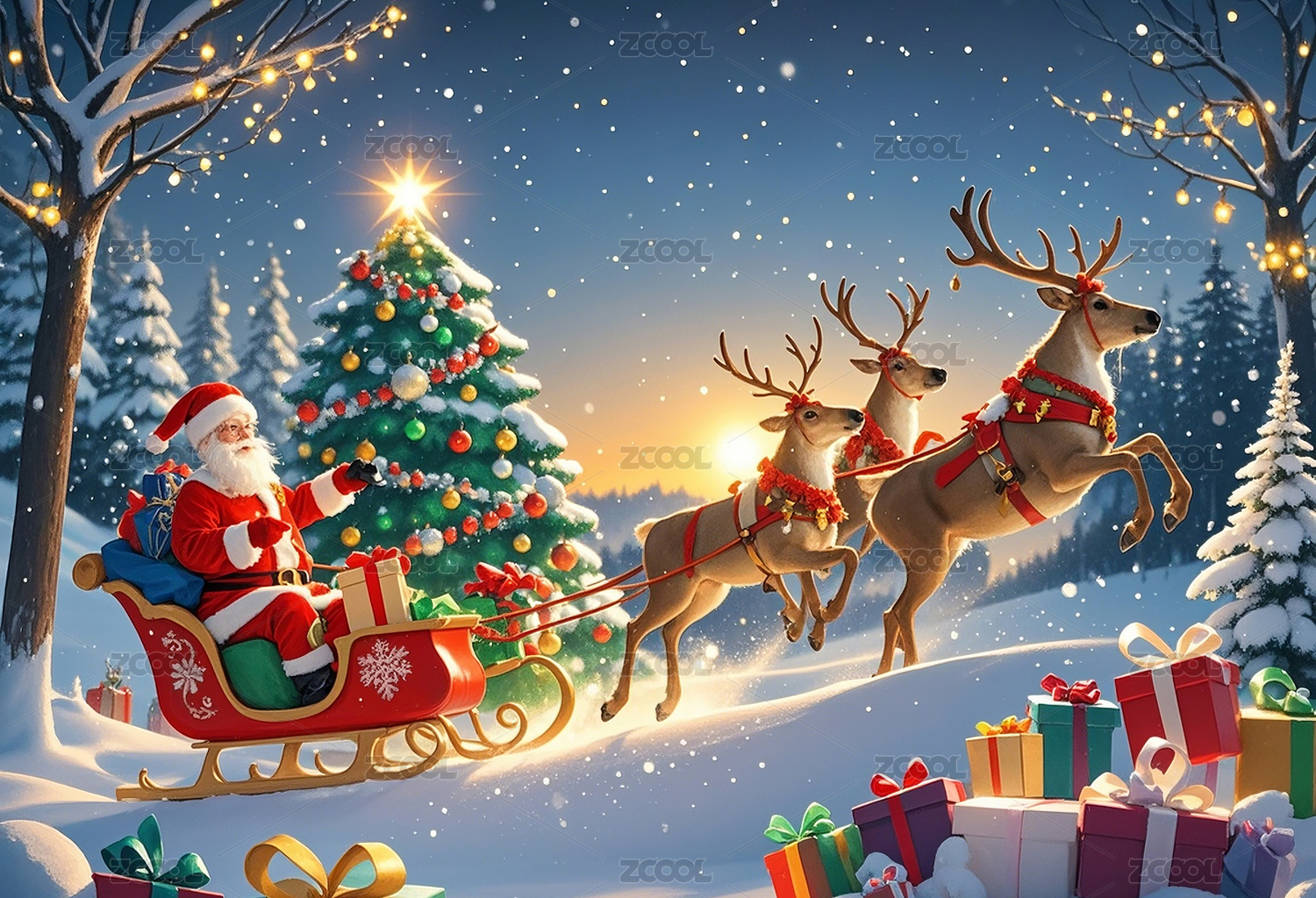圣诞节,圣诞老人,麋鹿,雪橇,插画,温馨,治愈,场景