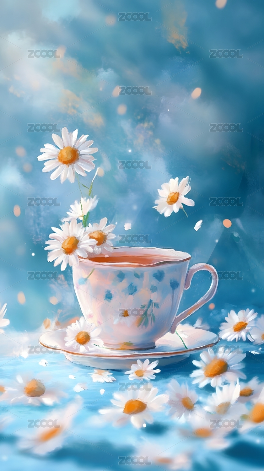 一杯茶和雏菊的清新画面
