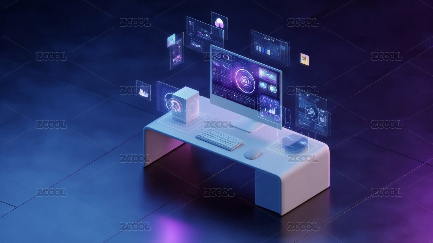 三维立体,3D,插画,电脑,科技,未来,紫色,蓝色,光影,设计