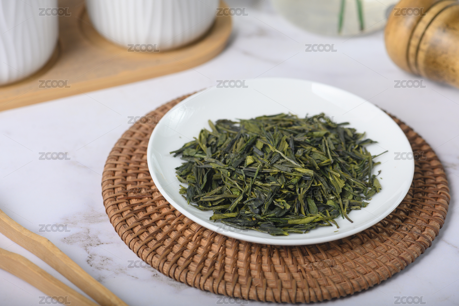 桌面上的盘子里的干爽清香的龙井茶叶