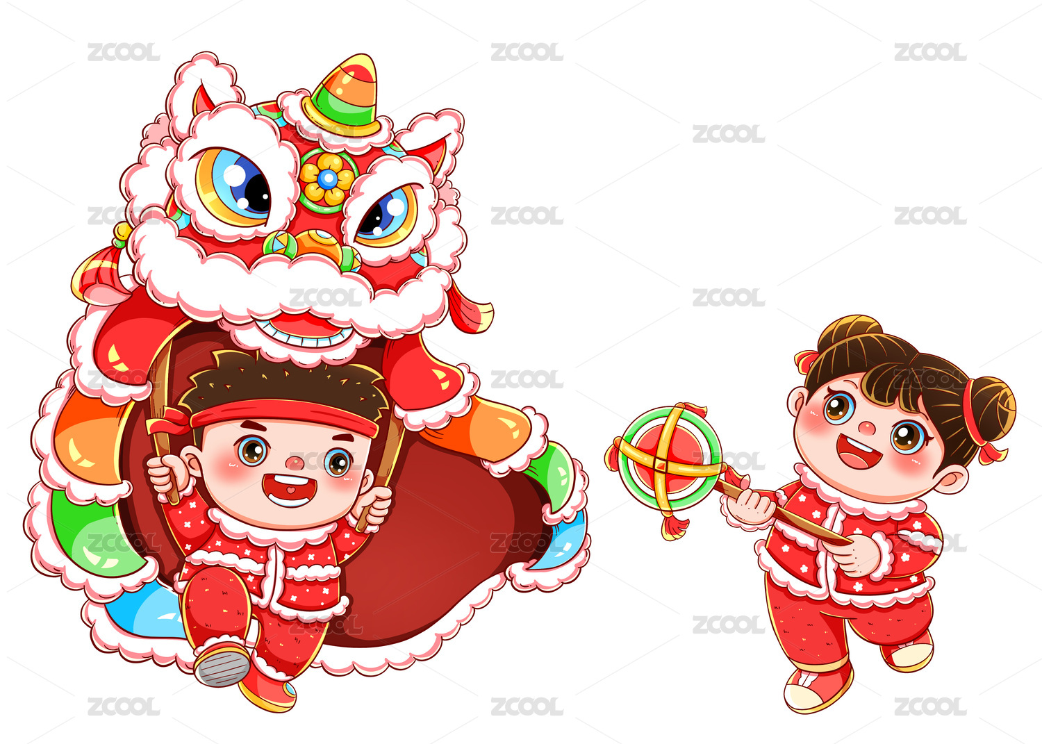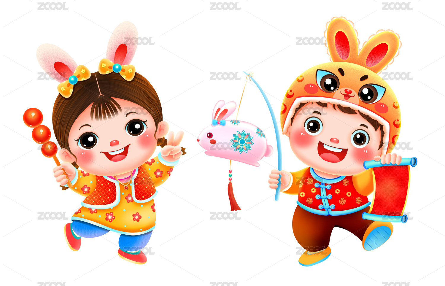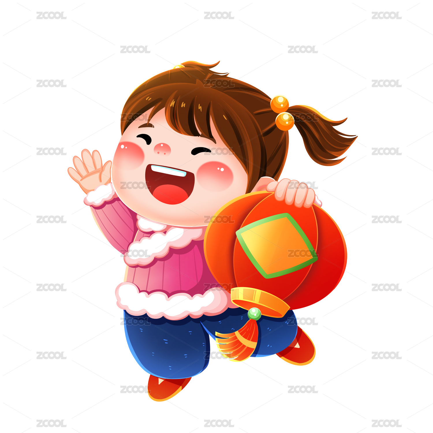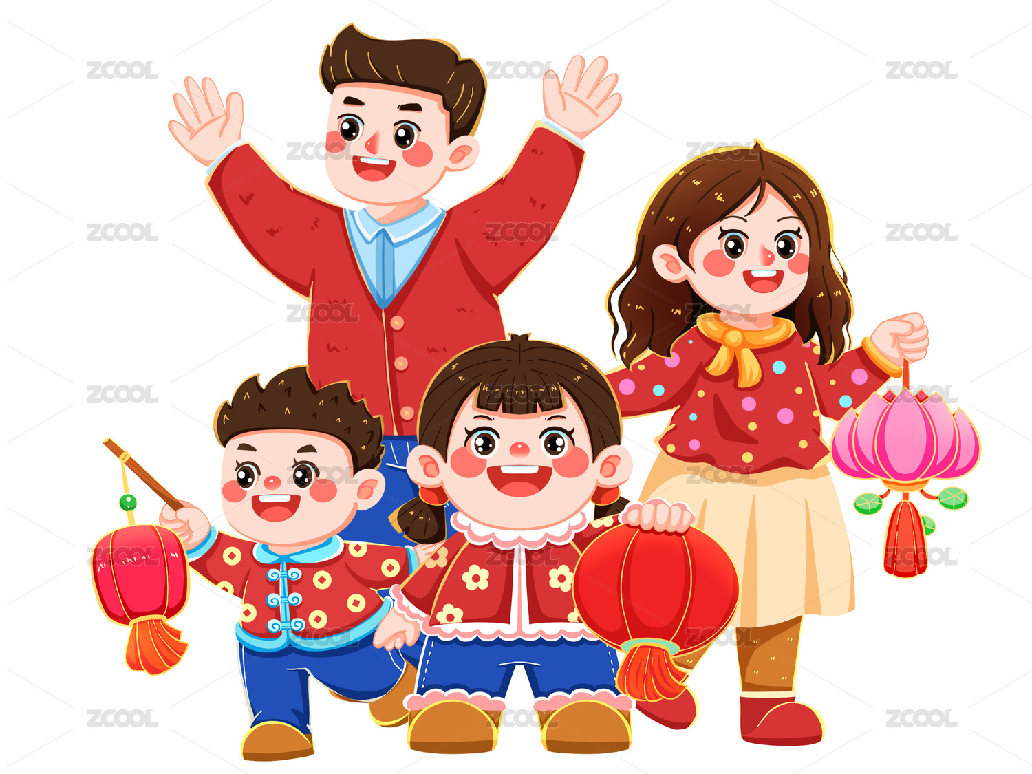 新年春节提灯笼放鞭炮的福娃男孩女孩
