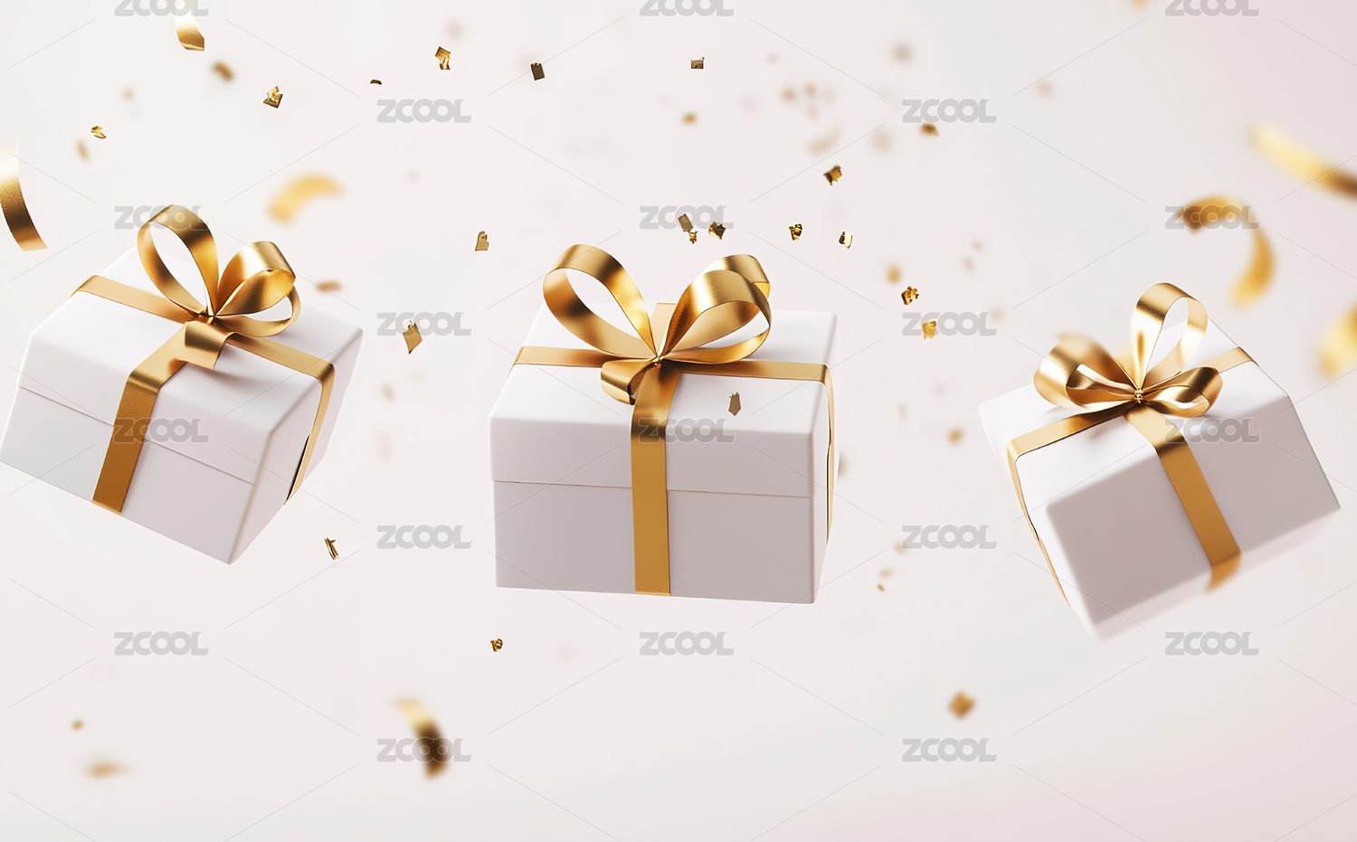 漂浮的白色礼物盒和金色纸屑营造节日气氛
