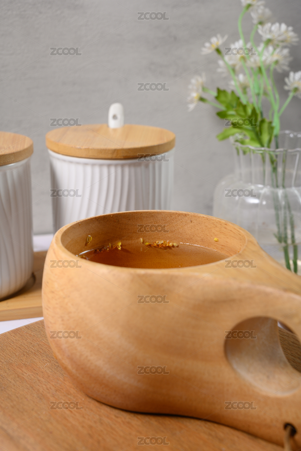 桌面上的杯子里的干爽清香的玳玳花茶