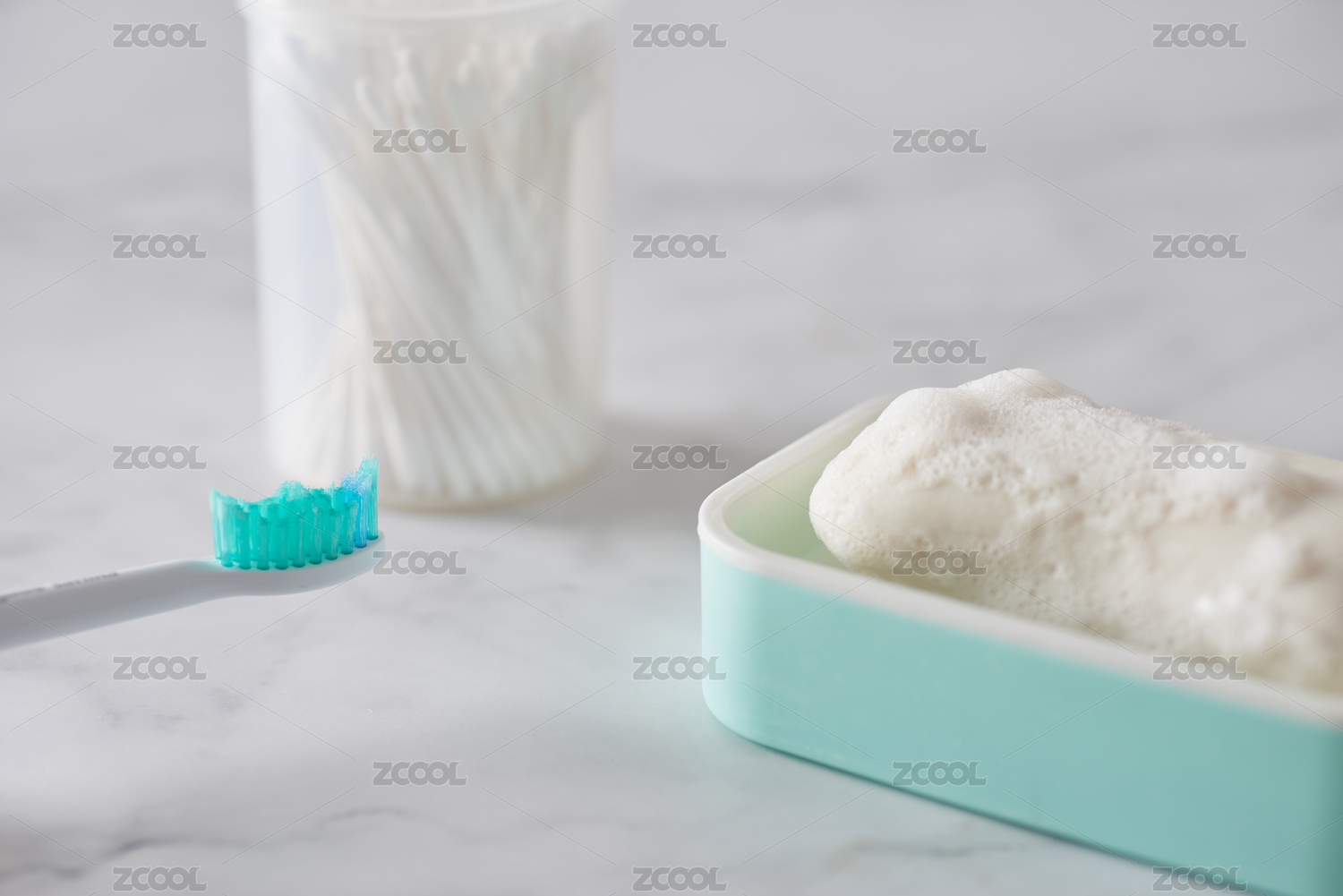 大理石台面上的香皂和牙刷以及棉签