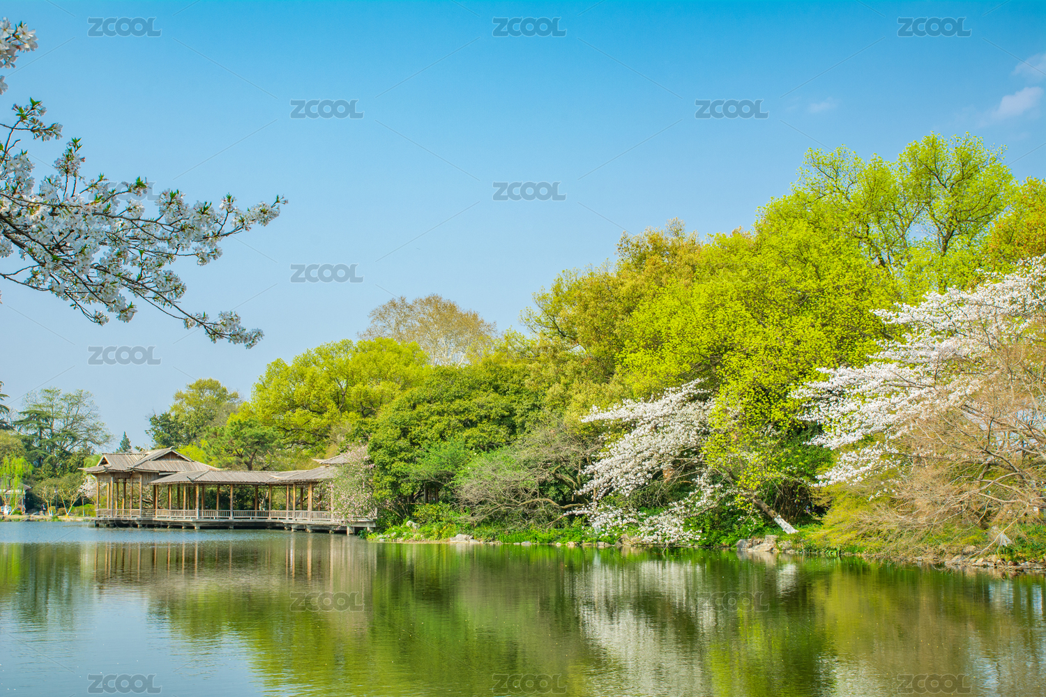 中国浙江杭州西湖花港观鱼春景,树林樱花
